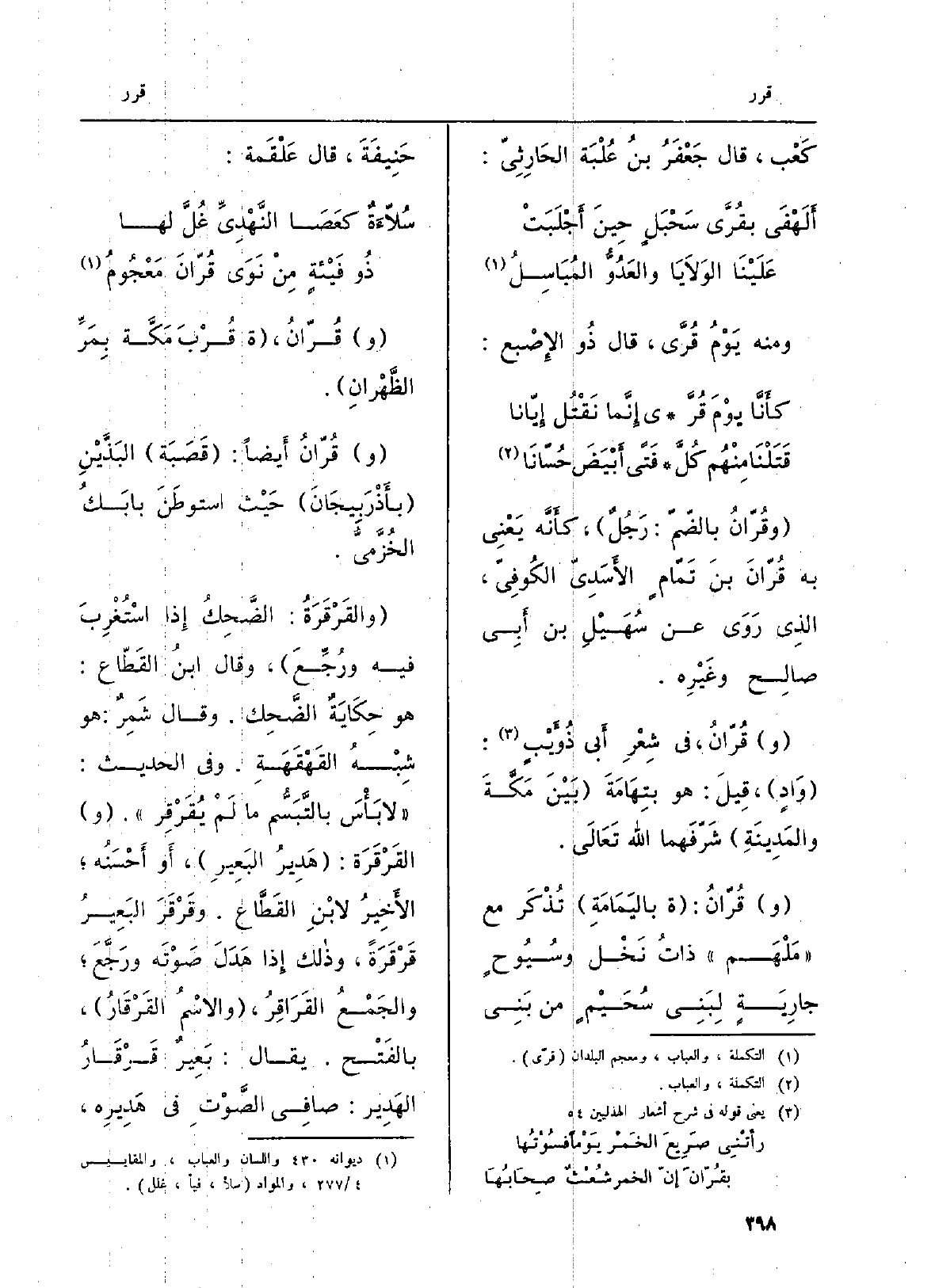 وقُرّانُ، ة قُرْبَ مَكَّة بِمَرِّ الظَّهْرانِ. وقُرّانُ أَيضاً: قَصَبَة البَذَّيْنِ بأَذْرَبْيجَانَ حَيْث استوطَنَ بابَكُ الخُزَّميّ. {والقَرْقَرَةُ: الضَّحِكُ إِذا اسْتُغْرِبَ فِيهِ ورُجِّعَ، وَقَالَ ابنُ القَطّاع: هُوَ حِكَايَةٌ الضَّحِك.
