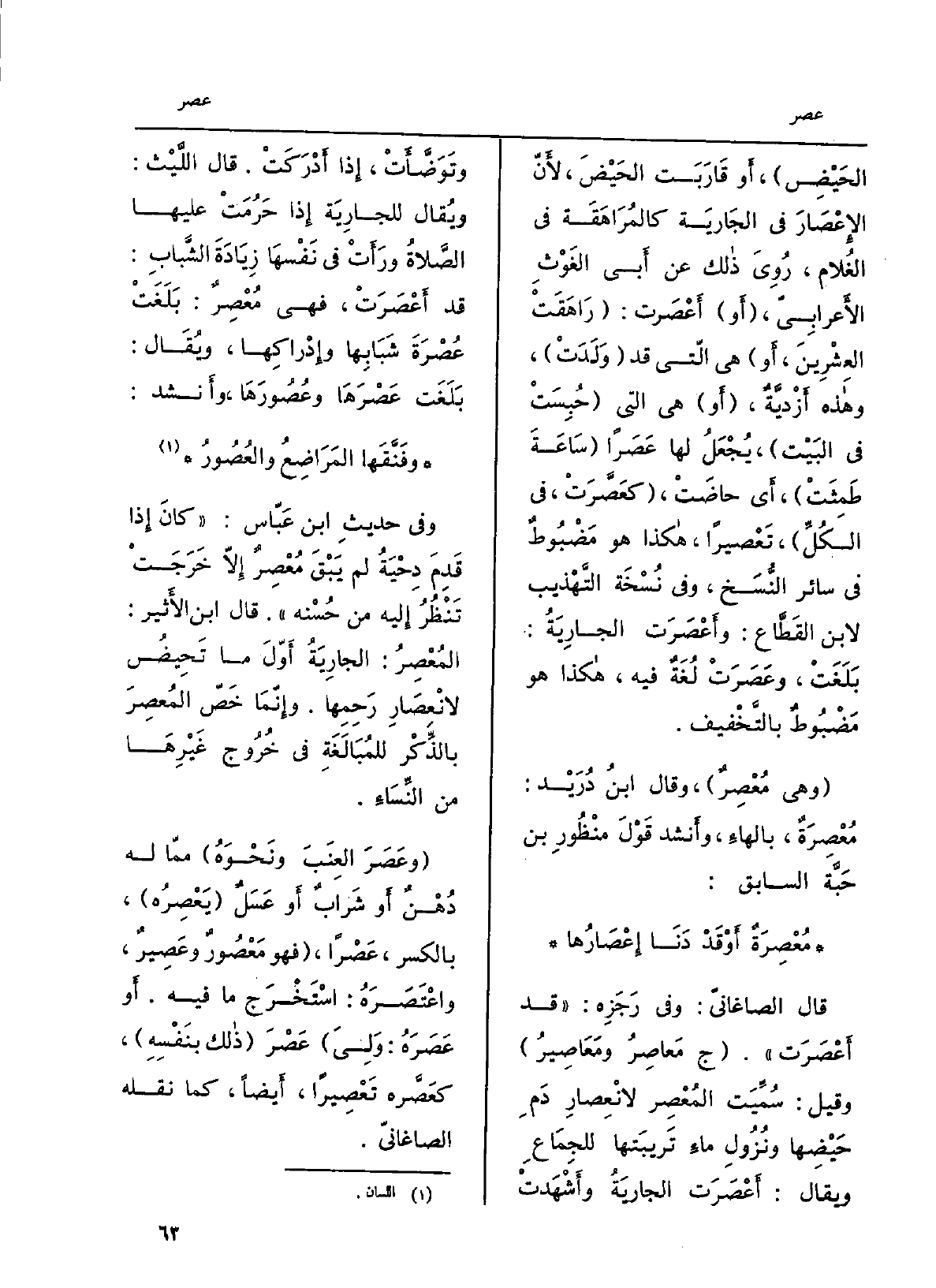 قَالَ الصاغانيّ: وَفِي رَجَزِه: قد أَعْصَرَت. ج مَعاصِرُ ومَعَاصِيرُ وَقيل: سُمِّيَت المُعْصِر لانْعِصارِ دَمِ حَيْضِها ونُزُولِ ماءِ تَريبَتها للجِمَاعِ وَيُقَال: أَعْصَرَت الجاريَةُ وأَشْهَدتْ وتَوَضَّأَتْ، إِذا أَدْرَكَتْ. قَالَ اللَّيْث: ويُقال للجارِيَة إِذا حَرُمَتْ عَلَيْهَا الصَّلاةُ ورَأَتْ فِي نَفْسَها زِيَادَةَ الشَّبابِ: قد أَعْصَرَتْ، فَهِيَ مُعْصِرٌ: بَلَغَتْ عُصْرَةَ شَبَابِها وإِدْراكِها، ويُقَال: بَلَغَت عَصْرَهَا وعُصُورَهَا، وأَنشد: وفَنَّقَها المَرَاضِعُ والعُصُورُ.)
