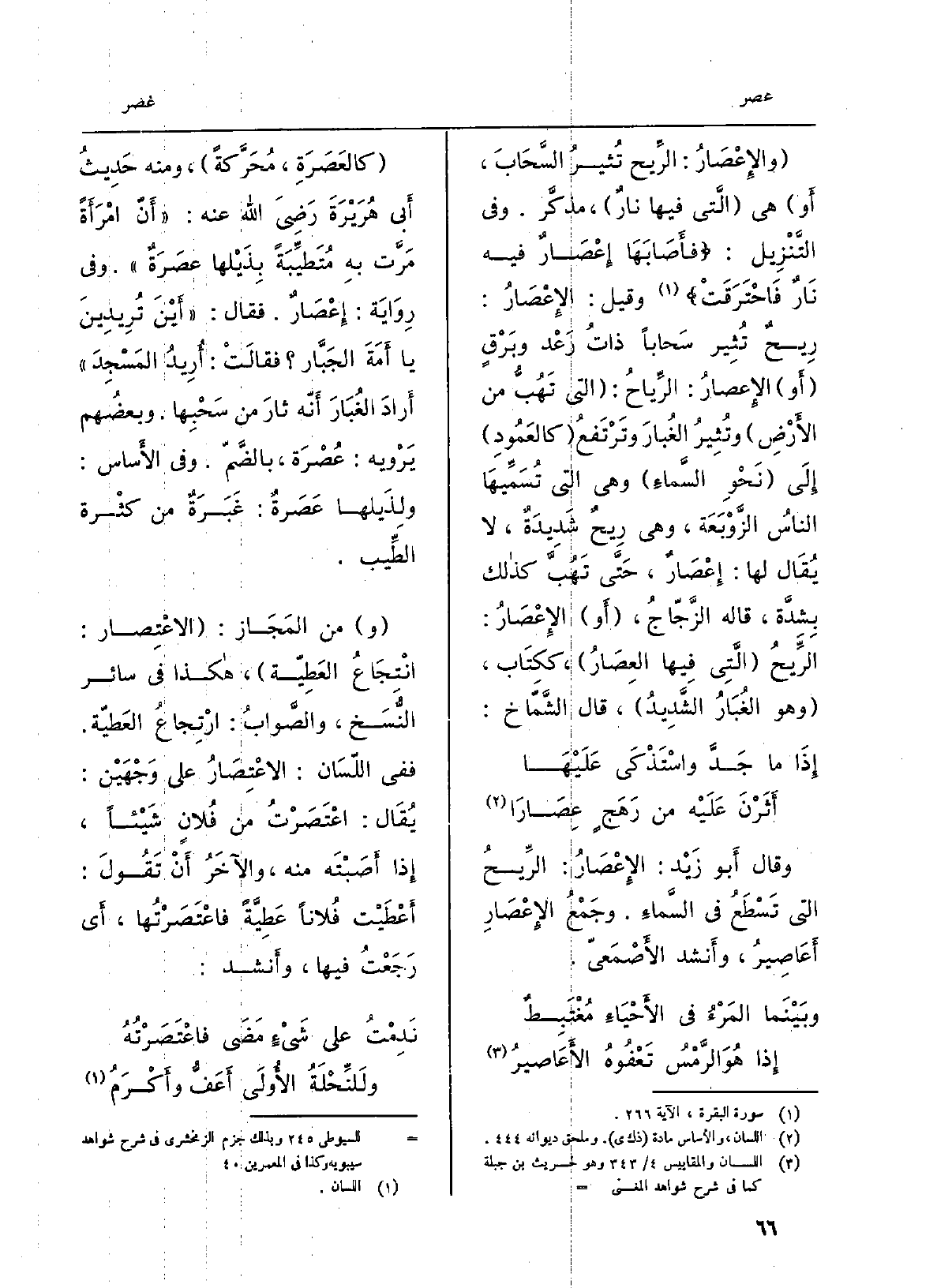كالعَصَرَةِ، مُحَرَّكةً، وَمِنْه حَدِيثُ أَبي هُرَيْرَةَ رَضِيَ الله عَنهُ: أَنّ امْرَأَةً مَرَّت بهِ مُتَطِّيَبةً بِذَيْلها عَصَرَةٌ. وَفِي رِوَايَة: إِعْصَارٌ. فَقَالَ: أَيْنَ تُرِيدينَ يَا أَمَةَ الجَبَّار فقالَتْ: أُرِيدُ المَسْجِدَ أَرادَ الغُبَارَ أَنّه ثارَ من سَحْبِها. وبعضُهم يَرْويه: عُصْرَة، بالضَّمّ. وَفِي الأَساس: ولِذَيلها عَصَرةٌ: غَبَرَةٌ من كثْرة الطِّيب. وَمن المَجَاز: الاعْتِصار: انْتِجَاعُ العَطِيّة، هَكَذَا فِي سَائِر النُّسَخ، والصَّوابُ: ارْتِجاعُ العَطيّة. فَفِي اللّسَان: الاعْتِصَارُ على وَجْهَيْن: يُقَال: اعْتَصَرْتُ من فُلانٍ شَيْئاً، إِذا أَصَبْتَه مِنْهُ، والآخَرُ أَنْ تَقُولَ: أَعْطَيْت فُلاناً عَطِيَّةً فاعْتَصَرْتُها، أَي رَجَعْتُ فِيهَا،)