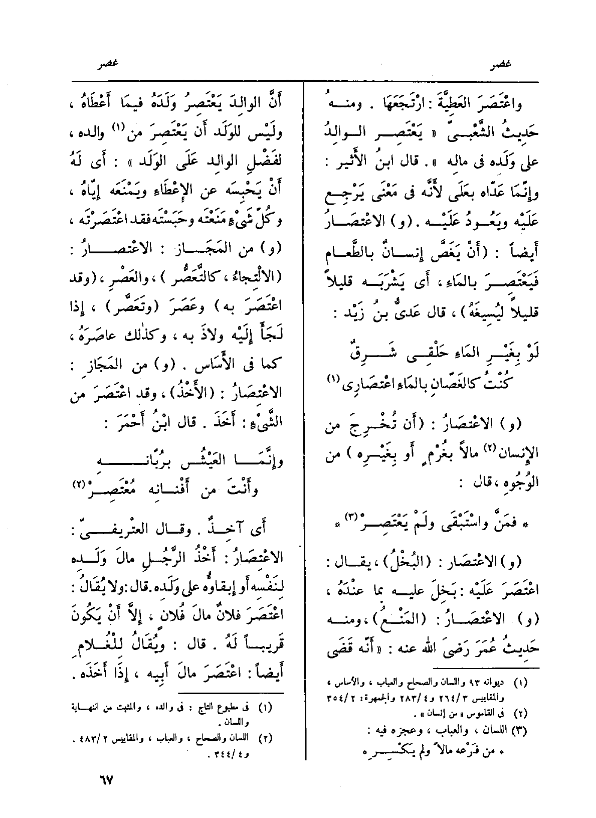 والاعْتصَار: البُخْلُ، يُقَال: اعْتَصَرَ عَلَيْه: بَخِلَ عَلَيْهِ بِمَا عنْدَهُ، والاعْتصَارُ: المَنْعُ، وَمِنْه حَدِيثُ عُمَرَ رَضيَ الله عَنهُ: أَنّه قَضَى أَنَّ الوالِدَ يَعْتَصِرُ وَلَدَهُ فيمَا أَعْطَاهُ، ولَيْس للوَلَد أَن يَعْتَصِرَ من وَالِده، لفَضْلِ الوالِد عَلَى الوَلَد: أَي لَهُ أَنْ يَحْبِسَه عَن الإِعْطَاءِ ويَمْنَعَه إِيّاهُ، وكُلّ شَيْءٍ مَنَعْتَه وحَبَسْتَه فقد اعْتَصَرْتَه، وَمن المَجَاز: الاعْتصارُ: الالْتِجاءُ، كالتَّعَصُّر، والعَصْرِ، وَقد اعْتَصَرَ بِهِ وعَصَرَ وتَعَصَّر، إِذا لَجَأَ إِلَيْه ولاذَ بِهِ، وَكَذَلِكَ عاصَرَهُ، كَمَا فِي الأَسَاس. وَمن المَجَازِ: الاعْتِصَارُ: الأَخْذُ، وَقد اعْتَصَرَ من الشَّيْءٍ: أَخَذَ. قَالَ ابْنُ أَحْمَرَ:
