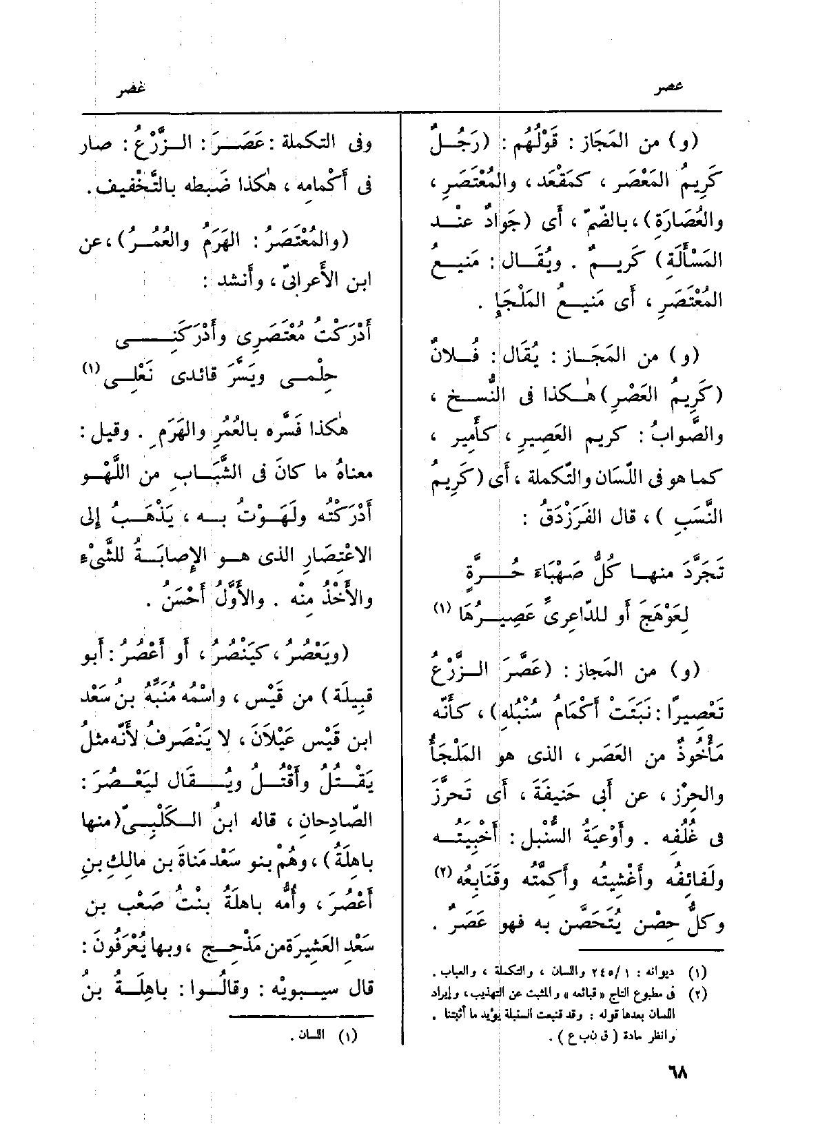 وَمن المَجَاز: قَوْلُهُم: رَجُلٌ كَرِيمُ المَعْصَر، كمَقْعَد، والمُعْتَصَرِ، والعُصَارَةِ، بالضّمّ، أَي جَوادٌ عنْد المَسْأَلَةِ كَريمٌ. ويُقَال: مَنيعُ المُعْتَصَرِ، أَي مَنيعُ المَلْجَإِ. وَمن المَجَاز: يُقَال: فُلانٌ كَرِيمُ العَصْرِ هَكَذَا فِي النُّسخ، والصَّوابُ: كريم العَصِيرِ، كأَمِير، كَمَا هُوَ فِي اللّسَان والتّكملة، أَي كَرِيمُ النَّسَبِ، قَالَ الفَرَزْدَقُ: