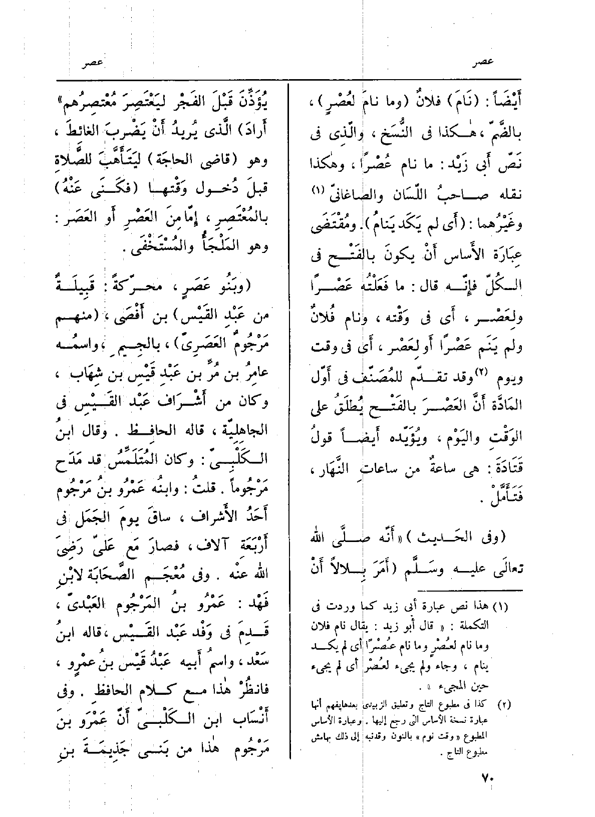 قَالَ: مَا فَعَلْتُه عَصْراً ولِعَصْر، أَي فِي وَقْته، ونام فُلانٌ وَلم يَنَم عَصْراً أَو لِعَصْر، أَي فِي وَقت وَيَوْم وَقد تقدّم للمُصَنّف فِي أَوّل المَادَّة أَنَّ العَصْرَ بالفَتْح يُطلَقُ على الوَقْتِ واليَوْم، ويُؤَيّده أَيضاً قولُ قَتَادَةَ: هِيَ ساعةٌ من ساعاتِ النَّهَار، فَتَأَمَّلْ. وَفِي الحَديث أَنّه صلَّى الله تعالَى عَلَيْهِ وسَلَّم أَمَرَ بِلالاً أَنْ يُؤَذِّنَ قَبْلَ الفَجْر ليَعْتَصِرَ مُعْتصِرُهم أَرادَ الَّذي يُريدُ أَنْ يَضْربَ الغائِطَ، وَهُوَ قَاضِي الحاجَة لَيَتَأَهَّبَ للصَّلاةِ قبلَ دُخول وَقْتِها فكَنَى عَنْهُ بالمُعْتَصِرِ، إِمّا مِنَ العَصْرِ أَو العَصَر: وَهُوَ المَلْجَأُ والمُسْتَخْفَى. وبَنُو عَصَرٍ، محرّكةً: قَبِيلَةٌ من عَبْدِ القَيْس بن أَفْصَى، مِنْهُم مَرْجُومٌ العَصَرِيّ، بالجِيم، واسمُه عامِرُ بن مُرِّ بن عَبْدِ قَيْسِ بن شِهَاب، وَكَانَ من أَشْرَاف عَبْد القَيْسِ فِي الجاهِلِيّة، قَالَه الحافِظ. وَقَالَ ابنُ الكَلْبِيّ: وَكَانَ المُتَلَمِّسُ قد مَدَح مَرْجُوماً. قلتُ: وابنُه عَمْرُو بنُ مَرْجُوم أَحَدُ الأَشراف، ساقَ يومَ الجَمَل فِي أَرْبَعَةِ آلَاف، فصارَ معَ عَليّ رَضِيَ الله عَنهُ. وَفِي مُعْجَم الصَّحَابَة لابْنِ فَهْد: عَمْرُو بنُ المَرْجُوم العَبْديّ، قَدِمَ فِي وَفْد عَبْد القَيْس، قَالَه ابنُ سَعْد، واسمُ أَبيه عَبْدُ قَيْس بنُ عمْروٍ، فانْظُرْ هَذَا مَعَ كَلَام الحافظِ. وَفِي أَنْسَاب ابْن الكَلْبيّ أَنّ عَمْرَو بنَ مَرْجُوم هَذَا من بَني جَذِيمَةَ بن