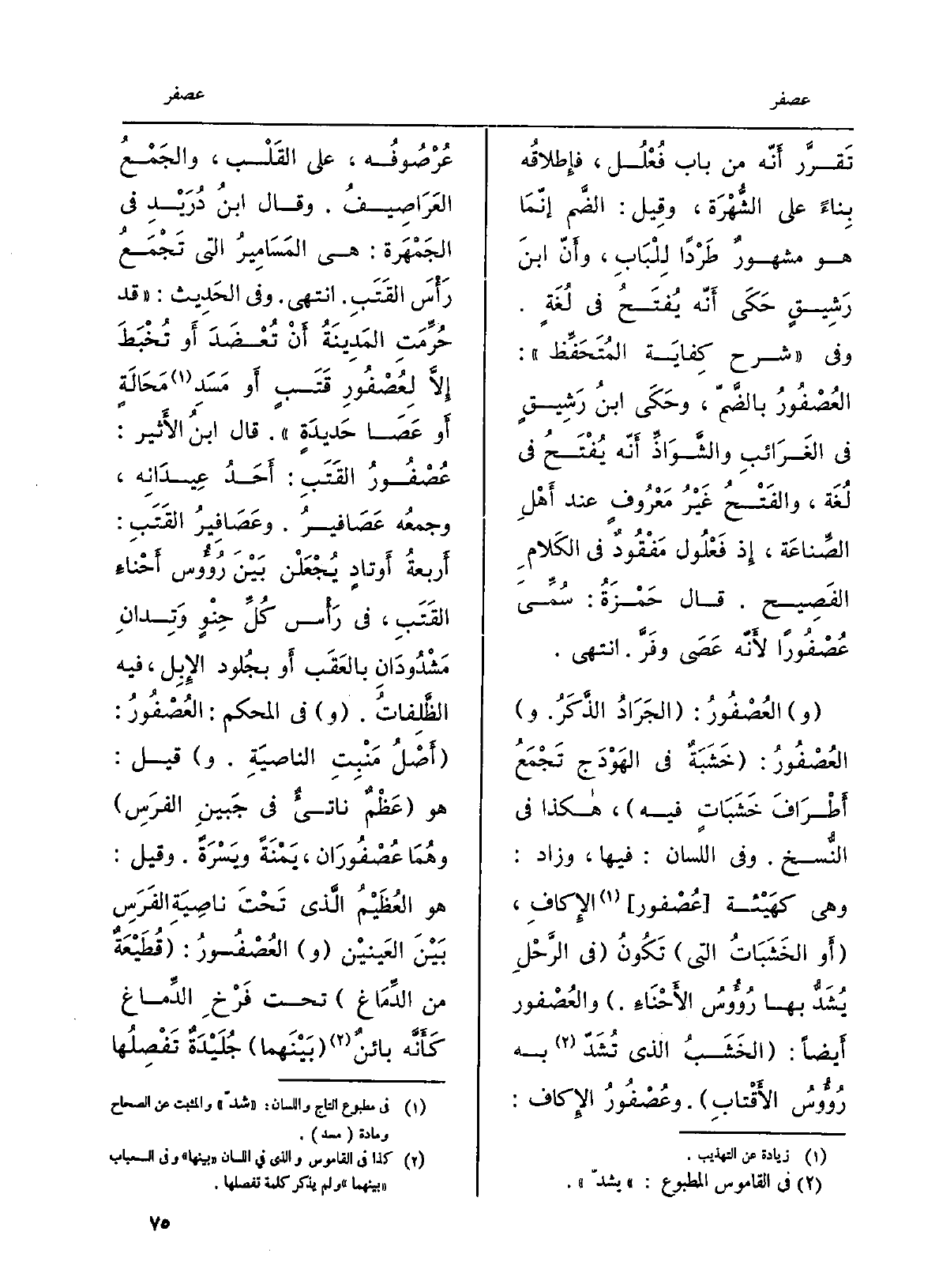 تَقَرَّر أَنّه من بَاب فُعْلُل، فإِطلاقُه بِناءً على الشُّهْرَة، وقِيل: الضَّم إِنّمَا هُوَ مشهورٌ طَرْداً لِلْبَابِ، وأَنّ ابنَ رَشِيقٍ حَكَى أَنّه يُفْتَحُ فِي لُغَةٍ. وَفِي شرح كِفَايَة المُتَحَفِّظ: العُصْفُورُ بالضَّمّ، وحَكَى ابنُ رَشِيقٍ فِي الغَرَائبِ والشَّوَاذِّ أَنّه يُفْتَحُ فِي لُغَة، والفَتْحُ غَيْرُ مَعْرُوفٍ عِنْد أَهْلِ الصِّناعَة، إِذ فَعْلُول مَفْقُودٌ فِي الكَلامِ الفَصِيح. قَالَ حَمْزَةُ: سُمِّىَ عُصْفُوراً لأَنّه عَصَى وفَرَّ. انْتهى. والعُصْفُورُ: الجَرَادُ الذَّكَرُ.