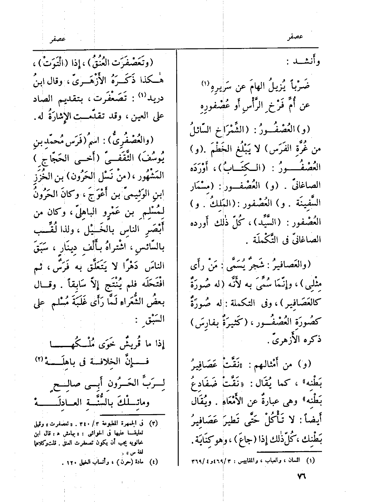 والعُصْفُورُ: الشِّمْرَاخ السّائلُ من غُرَّةِ الفَرَس لَا يَبْلُغ الخَطْمَ. والعُصْفُورُ: الكِتَابُ، أَوْرَدَه الصاغانيّ. والعُصْفور: مِسْمَار السَّفِينَة. والعُصْفور: المَلِكُ. والعُصْفور: السَّيِّد، كُلّ ذَلِك أَورده الصاغانيّ فِي التَّكْملَة. والعَصافيرُ: شَجرٌ يُسَمَّى: مَنْ رأَى مِثْلِي، وإِنّمَا سُمِّيَ بِهِ لأَنَّه لَهُ صُورَةٌ كالعَصَافِير، وَفِي التكملة: لَهُ صُوْرَةٌ كصُورَةِ العُصْفُور، كَثيرَةٌ بفارِسَ ذكره الأزهريّ. وَمن) أَمْثالهم: نَقَّتْ عَصَافِيرُ بَطْنِه، كَمَا يُقَال: نَقَّتْ ضَفَادِعُ بَطْنِه وَهِي عبارةٌ عَن الأَمْعَاءِ. ويُقَال أَيضاً: لَا تَأْكُلْ حَتَّى تَطيرَ عَصَافِيرُ بَطْنِك، كُلّ ذَلِك إِذا جاعَ، وَهُوَ كِنَايَة. وتَعَصْفَرَت العُنُقُ، إِذا الْتَوَتْ، هَكَذَا ذَكَرَهُ الأَزْهَريّ، وَقَالَ ابنُ دُرَيْد: تَصَعْفَرت، بِتَقْدِيم الصَّاد على الْعين، وَقد تقدّمت الإِشَارَةُ لَهُ. والعُصْفُرِيُّ: اسمُ فَرَس مُحَمّدِ بنِ يُوسُفَ الثَّقَفيّ أَخى الحَجّاجِ المَشْهُور، من نَسْل الحَرُون بن الخُزَزِ ابنِ الوَثِيميّ بن أَعْوَجَ، وكانَ الحَرُونُ لِمُسْلمِ بن عَمْروٍ الباهِليّ، وَكَانَ من أَبْصَرِ الناسِ بالخَيْل، وَلذَا لُقِّب بالسّائسِ، اشْتراهُ بأَلْفِ دِينَارٍ، سَبَقَ الناسَ دَهْراً لَا يَتَعَلَّق بِهِ فَرَسٌ، ثمَّ افْتَحَلَه فَلم يُنْتَج إِلاّ سَابِقاً. وَقَالَ بعضُ الشُّعَراءِ لَمَّا رَأَى غَلَبَةَ مُسْلم على السَبْقِ: