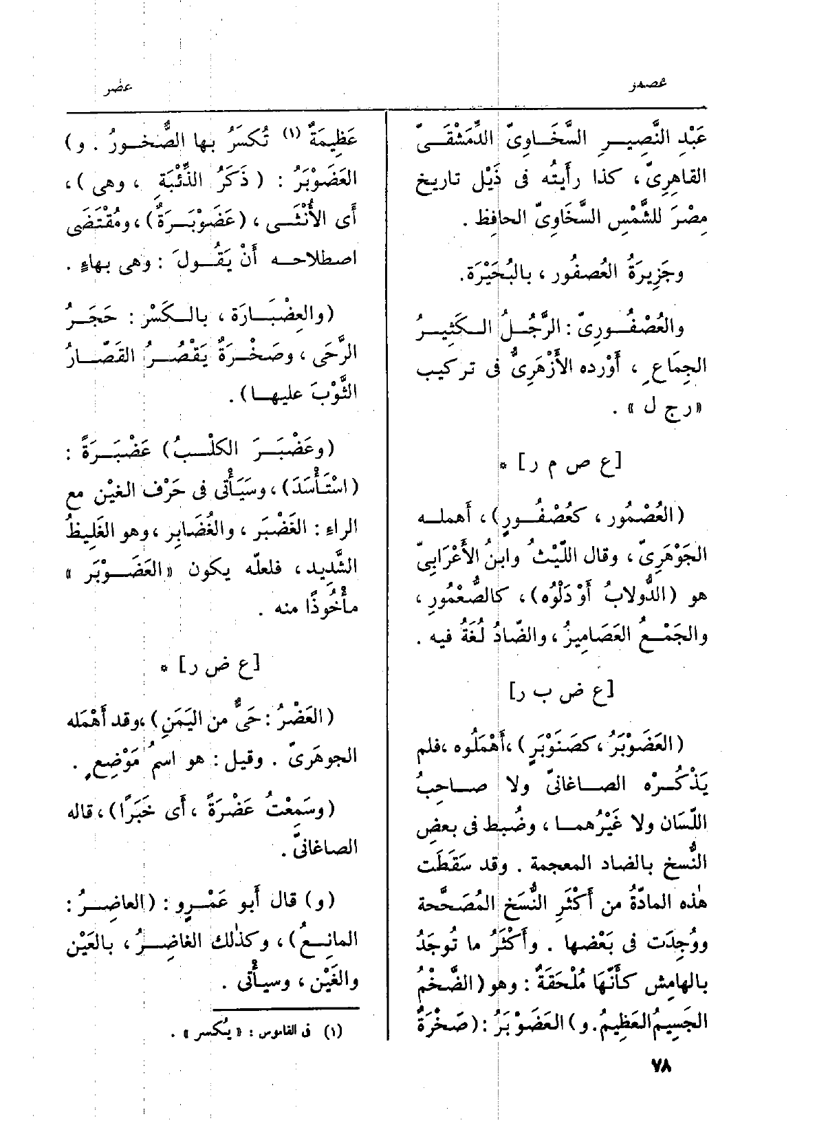 . العَضَوْبَرُ، كصَنْوْبَرٍ، أَهْمَلُوه، فَلم يَذْكُرْه الصاغانيّ وَلَا صاحِبُ اللّسَان وَلَا غَيْرُهما، وضُبط فِي بعضِ النُّسخ بالضاد الْمُعْجَمَة. وَقد سقَطَت هَذِه المادّةُ من أَكْثَرِ النُّسَخ المُصَحَّحة ووُجِدَت فِي بَعْضها. وأَكْثَرُ مَا تُوجَدُ بالهامِش كأَنّهَا مُلْحَقَةٌ: وَهُوَ الضَّخْمُ الجَسِيمُ العَظِيمُ. والعَضَوْبَرُ: صَخْرَةٌ عَظِيمَةٌ تُكْسَرُ بهَا الصُّخورُ. والعَضَوْبَرُ: ذَكَرُ الذِّئْبَةِ، وَهِي، أَي الأُنْثَى، عَضَوْبَرَةٌ، ومُقْتَضَى اصْطِلَاحه أَنْ يَقُولَ: وَهِي بهاءٍ. والعِضْبَارَة، بالكَسْر: حَجَرُ الرَّحَى، وصَخْرَةٌ يَقْصُرُ القَصّارُ الثَّوْبَ عَلَيْهَا. وعَضْبَرَ الكلْبُ عَضْبَرَةً: اسْتَأسَدَ، وسَيَأْتي فِي حَرف الغيْنِ مَعَ الراءِ: الغَضْبَر، والغَضَابِر، وَهُوَ الغَلِيظُ الشَّدِيد، فلعلَه يكون العَضَوْبَر مَأْخُوذاً مِنْهُ.