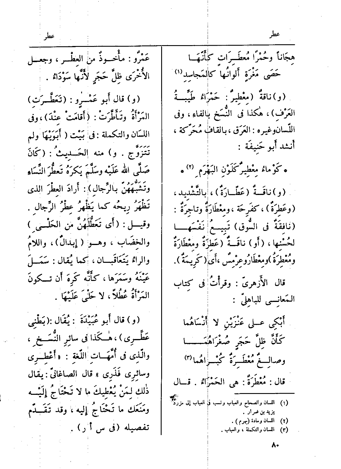 قَالَ: مُعْطَرَةٌ: هِيَ الحَمْرَاءُ. قَالَ عَمْروٌ: مأْخوذٌ من العِطْر، وَجعل الأُخْرَى ظِلَّ حَجَرٍ لأَنَّها سَوْدَاءُ. وَقَالَ أَبو عَمْروٍ: تَعَطَّرَتِ المَرْأَةُ وتَأَطَّرَتْ: أَقَامَتْ عِنْدَ، وَفِي اللسَان والتكملة: فِي بَيْت أَبَوَيْهَا وَلم تَتَزَوَّج. وَمِنْه الحَدِيثُ: كَانَ صَلَّى الله عَلَيْه وسَلَّمَ يَكرَهُ تَعَطُّرَ النِّسَاءِ وتَشَبُّهَهُنّ)