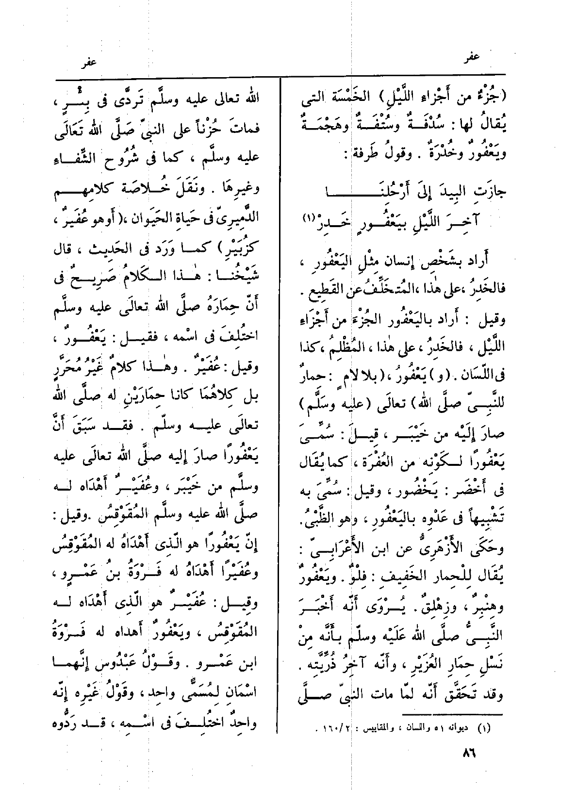 أَراد بشَخْصِ إِنسان مِثْلِ اليَعْفُورِ، فالخَدِرُ، على هَذَا، المُتخَلِّفُ عَن القَطِيع وَقيل: أَراد باليَعْفُور الجُزْءَ من أَجْزَاءِ اللَّيْل، فالخَدِرُ، على هَذَا، المُظْلِمُ، كَذَا فِي اللّسَان. ويَعْفُورُ، بِلَا لامٍ: حِمارٌ للنَّبِيّ صلَّى الله تعالَى عَلَيْهِ وسَلَّم صارَ إِلَيْه من خَيْبَر، قِيلَ: سُمِّيَ يَعْفُوراً لكَوْنِه من العُفْرَة، كَمَا يُقَال فِي أَخْضَر: يَخْضُور، وَقيل: سُمِّي بِهِ تَشْبِيهاً فِي عَدْوِه باليَعْفُورِ، وَهُوَ الظَّبْيُ. وحَكَى الأَزْهَرِيُّ عَن ابْن الأَعْرَابِيّ: يُقَال لِلْحِمار الخَفِيفِ: فِلْوٌ. ويَعْفُورٌ وهِنْبِرٌ، وزِهْلِقٌ. يُرْوَي أَنّه أَخْبَرَ النَّبِيُّ صلَّى الله عَلَيْه وسلّم بأَنَّه مِنْ نَسْلِ حِمَارِ العُزَيْرِ، وأَنّه آخِرُ ذُرِّيَّتِه. وَقد تَحَقَّق أنَهّ لمّا مَاتَ النبيّ صلَّى الله تَعَالَى عَلَيْهِ وسلَّم تَردَّى فِي بِئْرٍ، فماتَ حُزْناً على النبيّ صَلَّى الله تَعَالىَ عَلَيْهِ وسلَّم، كَمَا فِي شُرُوح الشِّفاءِ وغيرَها. ونَقَلَ خُلاصَة كلامِهم الدَّمِيريّ فِي حَياةِ الحَيَوان، أَو هُوَ عُفَيْرٌ، كزُبَيْرِ كَمَا وَرَد فِي الحَدِيث، قَالَ شَيْخُنا: هَذَا الكَلامُ صَرِيحٌ فِي أَنّ حِمَارَهُ صلَّى الله تعالَى عَلَيْهِ وسلَّم اختُلِفَ فِي اسْمه، فَقيل: يَعْفُورٌ، وَقيل: عُفَيْرٌ. وَهَذَا كلامٌ غَيْرُ مُحَرَّرٍ بل كِلاهُمَا كَانَا حِمَارَيْنِ لَهُ صلَّى الله تعالَى عَلَيْهِ وسلّم. فقد سَبَقَ أَنَّ يَعْفُوراً صارَ إِليه صلَّى الله تعالَى عَلَيْهِ وسلَّم من خَيْبَر، وعُفَيْرٌ أَهْدَاه لَهُ صلَّى الله عَلَيْهِ وسلَّم المُقَوْقِسُ. وقِيل: إِنّ يَعْفُوراً هُوَ الّذِي أَهْدَاهُ لَهُ المُقَوْقِسُ وعُفَيْراً أَهْدَاهُ لَهُ فَرْوَةُ بنُ عَمْروٍ، وقِيل: عُفَيْرٌ هُوَ الَّذِي أَهْدَاه لَهُ المُقَوْقِسُ، ويَعْفُورٌ أَهداه لَهُ فَرْوَةُ ابْن عَمْرو. وقَوْلُ عَبْدُوس إِنَّهما اسْمَانِ لِمُسَمّىً واحِد، وقَوْلُ غَيْرِه إِنّه واحِدٌ اختُلِفَ فِي اسْمِه، وَقد رَدُّوه