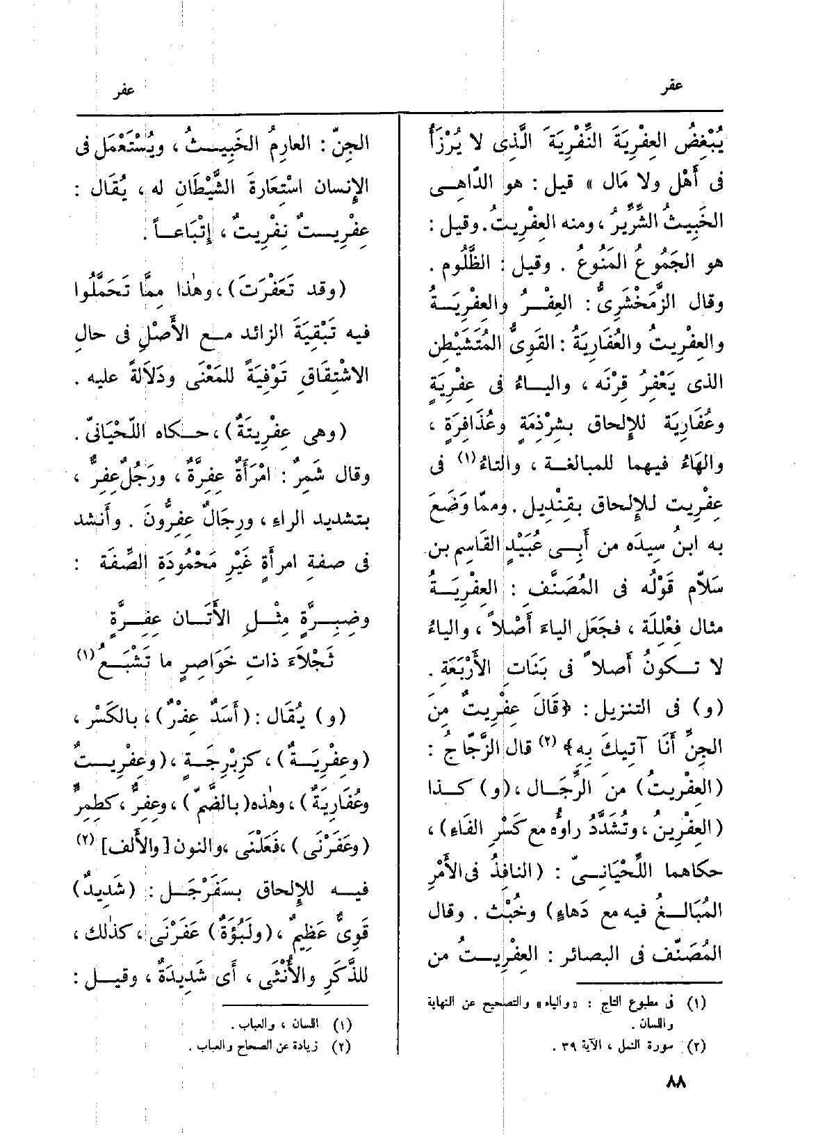 يُبْغِضُ العِفْرِيَةَ النِّفْرِيَةَ الَّذِي لَا يُرْزَأُ فِي أَهْل وَلَا مَال قيل: هُوَ الدّاهِي الخَبِيثُ الشِّرِّيرُ، وَمِنْه العِفْرِيتُ. وَقيل: هُوَ الجَمُوعُ المَنُوعُ. وَقيل: الظَّلُوم. وَقَالَ الزَّمَخْشَرِيُّ: العِفْرُ والعِفْريَةُ والعِفْرِيتُ والعُفَارِيَةُ: القَوِيُّ المُتَشَيْطِن الَّذِي يَعْفِرُ قِرْنَه، والياءُ فِي عِفْرِيَةٍ وعُفَارِيَة للإِلحاق بشرِذْمَةٍ وعُذَافِرَهٍ، والهَاءُ فيهمَا للْمُبَالَغَة، والتاءُ فِي عِفْرِيت للإِلحاق بقِنْدِيل. وممّا وَضَعَ بِهِ ابنُ سِيدَه من أَبِي عُبَيْدٍ القَاسِم بن سَلاّم قَوْلُه فِي المُصَنَّفِ: العِفْرِيَةُ مِثَال فِعْلِلَة، فجَعَل الياءَ أَصْلاً، والياءُ لَا تكونُ أَصلاً فِي بَنَاتِ الأَرْبَعَةِ. وَفِي التَّنْزِيل: قَالَ عِفْرِيتٌ منَ الجِنِّ أَنَا آتِيكَ بِهِ قَالَ الزَّجّاجُ: العِفْريتُ منَ الرِّجَال، وَكَذَا العِفْرِينُ، وتُشَدَّدُ راؤُه مَعَ كَسْرِ الفَاءِ، حَكَاهُمَا اللَّحْيَانِيّ: النافِذُ فِي الأَمْرِ المُبَالغُ فِيهِ مَعَ دَهاءٍ وخُبْث. وَقَالَ المُصَنّف فِي البصائر: العِفْرِيتُ من الجِنّ: العارِمُ الخَبِيثُ، ويُسْتَعْمَل فِي الإِنسان اسْتِعَارةَ الشَّيْطَانِ لَهُ، يُقَال: عِفْرِيتٌ نِفْرِيتٌ، إِتْبَاعاً. وَقد تَعَفْرَتَ، وَهَذَا مِمَّا تَحَمَّلُوا فِيهِ تَبْقِيَةَ الزَّائِد مَعَ الأَصْلِ فِي حالِ الاشْتِقَاقِ تَوْفِيَةً للمَعْنَى ودَلالَةً عَلَيْهِ. وَهِي عِفْرِيتَةٌ، حَكَاهُ اللَّحْيَانِيّ. وَقَالَ شَمِرٌ: امْرَأَةٌ عِفِرَّةٌ، ورَجُلٌ عِفِرٌّ، بتَشْديد الراءِ، ورِجَالٌ عِفِرُّونَ. وأَنشد فِي صفةِ امرأَةٍ غَيْرِ مَحْمُودَةِ الصِّفَة: