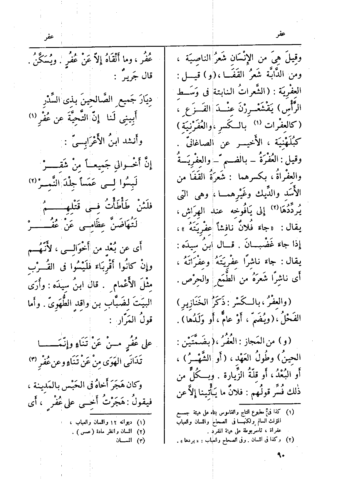وقِيلَ هِيَ من الإِنْسَانِ شَعرُ الناصِيَة، وَمن الدَّابَّة شَعرُ القَفَا، وَقيل: العِفْرِيَة: الشَّعراتُ النابتة فِي وَسَطِ الرَّأْسِ يَقْشَعْرِرْنَ عِنْدَ الفَزَعِ، كالعِفْرات بالكَسرِ، والعُفَرْنِيَةِ كبُلَهْنِيَة، الأَخير عَن الصاغانيّ.