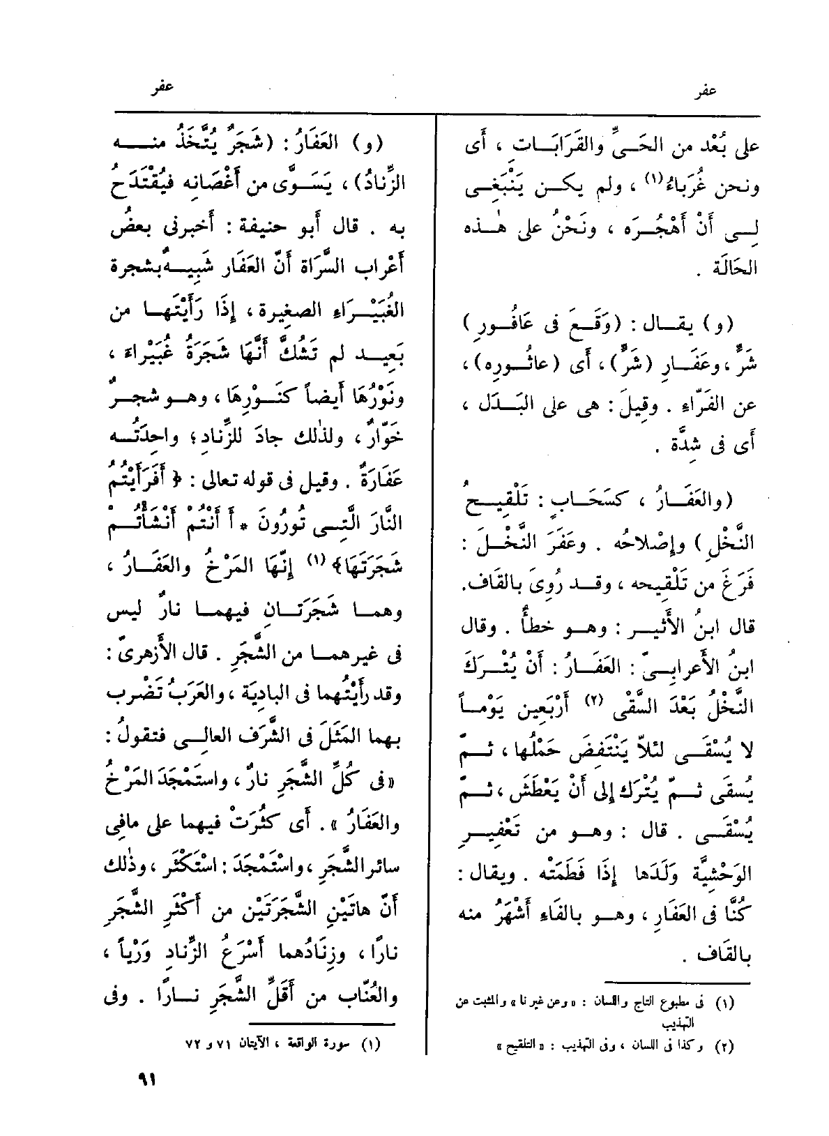 قَالَ ابنُ الأَثِير: وَهُوَ خطأٌ. وَقَالَ ابنُ الأَعْرَابِيّ: العَفَارُ: أَنْ يُتْرَكَ النَّخْلُ بَعْدَ السَّقْي أَرْبَعِين يَوْماً لَا يُسْقَى لئلاّ يَنْتَفِضَ حَمْلُها، ثمّ يُسْقَى ثمّ يُتْرَك إِلى أَنْ يَعْطَشَ، ثمّ يُسْقَى. قَالَ: وَهُوَ من تَعْفِيرِ الوَحْشِيَّة وَلَدَها إِذَا فَطَمَتْه. وَيُقَال: كُنَّا فِي العَفَارِ، وَهُوَ بالفَاءِ أَشْهَرُ مِنْهُ بالقَاف. والعَفَارُ: شَجَرٌ يُتَّخَذُ مِنْهُ الزِّنادُ، يَسَوَّى من أَغْصَانِه فيُقْتَدَحُ بِهِ. قَالَ أَبو حنيفَة: أَخبرني بعضُ أَعْراب السَّرَاة أَنّ العَفَار شَبِيهٌ بشجرة الغُبَيْرَاءِ الصغِيرة، إِذَا رَأَيْتَها من بَعِيد لم تَشُكَّ أَنَّهَا شَجَرَةُ غُبَيْراءَ، ونَوْرُها أَيضاً كنَوْرِهَا، وَهُوَ شجرٌ خَوّارٌ، وَلذَلِك جادَ للزِّنادِ واحِدَتُه عَفَارَةٌ. وَقيل فِي قَوْله تَعَالَى: أَفَرَأَيْتُمُ النَّارَ الَّتِي تُورُونَ. أَأَنْتُمْ أَنْشَأْتُمْ شَجَرَتَهَا إِنّهَا المَرْخُ والعَفَارُ، وهما شَجَرَتانِ فيهمَا نارٌ لَيْسَ فِي غَيرهمَا من الشَّجَرِ. قَالَ الأَزهريّ: وَقد رَأَيْتُهما فِي البادِيَة، والعَرَبُ تَضْرب بهما المَثَلَ فِي الشَّرَف العالِي فتقولُ: فِي كُلِّ الشَّجَرِ نارٌ، واسْتَمْجَدَ المَرْخُ والعَفَارُ. أَي كثُرَتْ فيهمَا على مَا فِي سَائِر الشَّجَرِ، واسْتَمْجَدَ: اسْتَكْثَر، وَذَلِكَ أَنّ هاتَيْنِ الشَّجَرَتَيْن من أَكْثَرِ الشَّجَرِ نَارا، وزِنَادُهما أَسْرَعُ الزِّنادِ وَرْياً، والعُنّاب من أَقَلِّ الشَّجَرِ نَارا. وَفِي