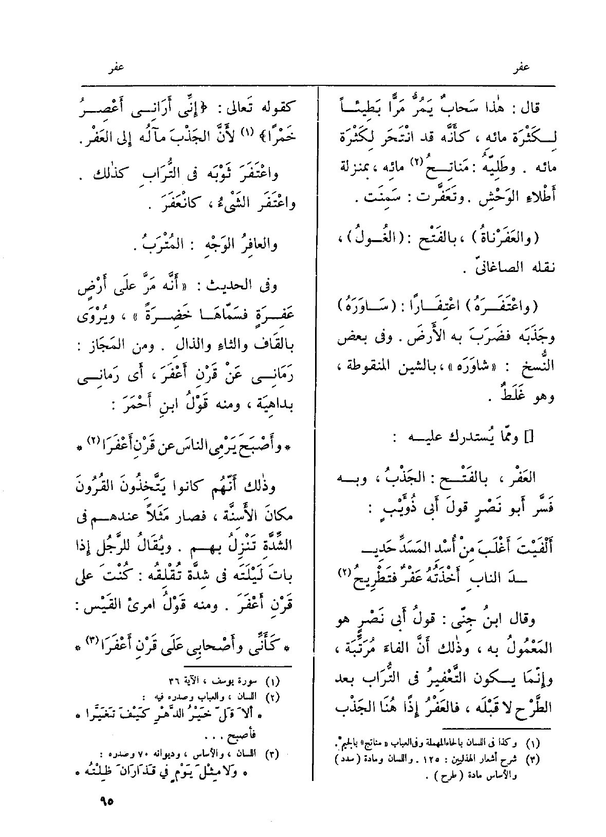 وَقَالَ ابنُ جِنّى: قولُ أَبي نَصْرٍ هُوَ المَعْمُولُ بِهِ، وَذَلِكَ أَنَّ الفاءَ مُرَتِّبَة، وإِنّمَا يكون التَّعْفِيرُ فِي التُّرَاب بعد الطَّرْح لَا قَبْلَه، فالعَفْرُ إِذاً هُنَا الجَذْب كَقَوْلِه تَعالى: إِنِّي أَرَانِي أَعْصِرُ خَمْراً لأَنَّ الجَذْبَ مآلُه إِلى العَفْر. واعْتَفَرَ ثَوْبَه فِي التُّرَابِ كَذَلِك. واعْتَفَر الشّيءُ، كانْعَفَرَ. والعافِرُ الوَجْهِ: المُتْرَبُ. وَفِي الحَدِيث: أَنَّه مَرَّ علَى أَرْضٍ عَفِرَةٍ فسَمّاهَا خَضِرَةً، ويُرْوَى بِالْقَافِ والثاءِ والذالِ.