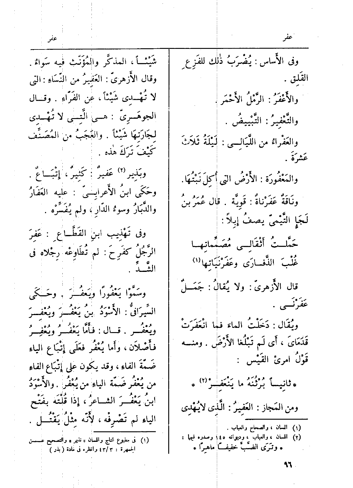 قَالَ الأَزهريّ: وَلَا يُقالُ: جَمَلٌ عَفَرْنَي. ويُقَال: دَخَلْتُ الماءَ فَمَا انْعَفَرَتْ قَدَمَايَ، أَي لَم تَبْلُغا الأَرْضَ. وَمِنْه قَوْلُ امْرِئ القَيْس: ثانِياً بُرْثُنَهُ مَا يَنْعَفِر. وَمن المَجاز: العَفِيرُ: الَّذِي لَا يُهْدِى شَيْئاً، المذكَّر والمُؤَنّث فِيهِ سَواءٌ. وَقَالَ الأَزهريّ: العَفِيرُ من النّسَاءِ: الَّتِي لَا تُهْدِى شَيْئاً، عَن الفَرّاءِ. وَقَالَ الجوهَرِيّ: هِيَ الَّتِي لَا تُهْدِى لِجَارَتِهَا شَيْئاً. والعَجَبُ من المُصَنِّف كَيْفَ تَرَكَ هَذِه. وبَذِير عَفيرٌ: كَثِيرٌ، إِتْبَاعٌ. وحَكَى ابنُ الأَعرابِيّ: عَلَيْهِ العَفَارُ والدَّبَارُ وسوءُ الدّارِ، وَلم يُفَسِّرْه. وَفِي تَهْذِيب ابنِ القَطَّاعِ: عَفِرَ الرَّجُلُ كفَرِحَ: لم تُطَاوِعْه رِجْلاه فِي الشَّدِّ. وسَمَّوْا يَعْفُوراً ويَعْفُرَ. وحَكَى السِيرَافيُّ: الأَسْوَدُ بنُ يَعْفُرَ ويُعْفِرَ ويُعْفُر. قَالَ: فأَمَّا يَعْفُرُ ويُعْفِرُ فأَصْلاَن، وأَما يُعْفُر فعَلَى إِتْبَاع الياءِ ضَمّةَ الفاءِ، وَقد يكون على إِتْبَاع الفاءِ من يُعْفُر ضَمّة الياءِ من يُعْفُر.