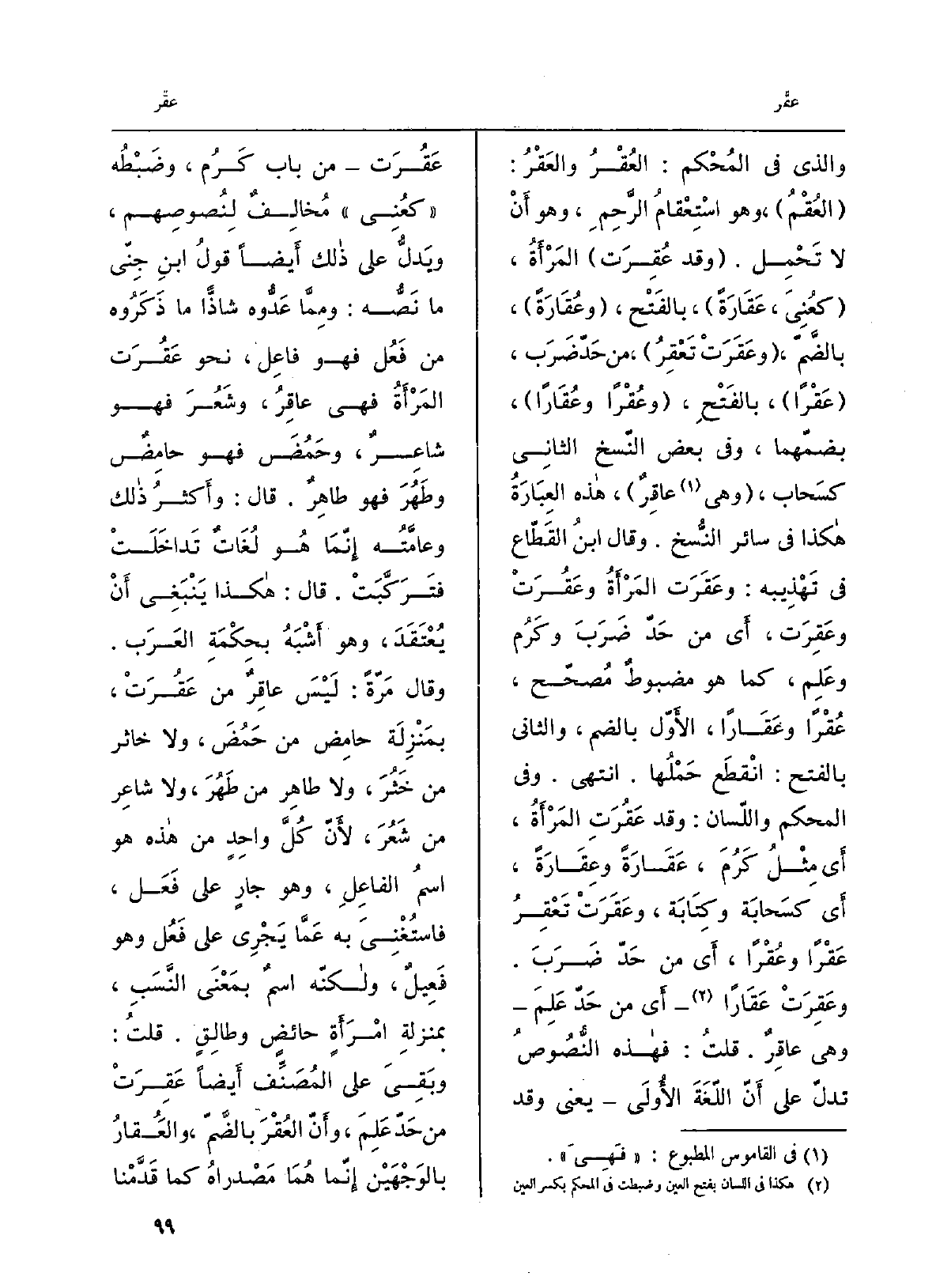 وَالَّذِي فِي المُحْكم: العُقْرُ والعَقْرُ: العُقْمُ، وَهُوَ اسْتِعْقامُ الرَّحِمِ، وَهُوَ أَنْ لَا تَحْمِل. وَقد عُقِرَت المَرْأَةُ، كعُنِىَ، عَقَارَةً، بالفَتْح، وعُقَارَةً، بالضَّمّ، وعَقَرَتْ تَعْقِرُ، من حَدّ ضَرَب، عَقْراً، بالفَتْحِ، وعُقْراً وعُقَاراً، بضمّهما، وَفِي بعض النّسخ الثانِي كسَحاب، وَهِي عاقِرٌ، هَذِه العِبَارَةُ هَكَذَا فِي سَائِر النُّسخ. وَقَالَ ابنُ القَطّاع فِي تَهْذِيبه: وعَقَرَت المَرْأَةُ وعَقُرَتْ وعَقِرَت، أَي من حَدّ ضَرَبَ وكَرُم وعَلِم، كَمَا هُوَ مضبوطٌ مُصحّح، عُقْراً وعَقَاراً، الأَوّل بِالضَّمِّ، وَالثَّانِي بِالْفَتْح: انْقطَع حَمْلُها. انْتهى. وَفِي الْمُحكم واللّسان: وَقد عَقُرَتِ المَرْأَةُ، أَي مِثْلُ كَرُمَ، عَقَارَةً وعقِاَرَةً، أَي كسَحابَة وكِتَابَة، وعَقَرَتْ تَعْقِرُ عَقْراً وعُقْراً، أَي من حَدّ ضَرَبَ. وعَقِرَتْ عَقَاراً أَي من حَدّ عَلِمَ وَهِي عاقِرٌ. قلتُ: فَهَذِهِ النُّصُوصُ تدلّ على أَنّ اللّغَةَ الأُوْلَى يَعْنِي وَقد عَقُرَت من بَاب كَرُم، وضَبْطُه كعُنِى مُخالِفٌ لِنُصوصِهم، ويَدلُّ على ذَلِك أَيضاً قولُ ابنِ جِنّى مَا نَصُّه: ومِمَّا عَدُّوه شاذّاً مَا ذَكَرُوه من فَعُل فَهُوَ فاعِل، نَحْو عَقُرَت المَرْأَةُ فَهِيَ عاقِرُ، وشَعُرَ فَهُوَ شاعِرٌ، وحَمُضَ فَهُوَ حامِضٌ وطَهُرَ فَهُوَ طاهِرٌ. قَالَ: وأَكثرُ ذَلِك وعامَّتُه إِنّمَا هُو لُغَاتٌ تَداخَلَتْ فتَرَكَّبَتْ. قَالَ هَكَذَا يَنْبَغِي أَنْ يُعْتَقَدَ، وَهُوَ أَشْبَهُ بحِكْمَةِ العَرَب. وَقَالَ مَرّةً: لَيْسَ عاقِرٌ من عَقُرَتْ، بمَنْزِلَة حامِض من حَمُضَ، وَلَا خاثر من خَثُرَ، وَلَا طاهِر من طَهُرَ، وَلَا شاعِر من شَعُرَ، لأَنّ كُلَّ واحِدٍ من هَذِه هُوَ اسمُ الفاعِلِ، وَهُوَ جارٍ على فَعَل، فاستُغْنِىَ بِهِ عَمَّا يَجْرِي على فَعُل وَهُوَ فَعِيلٌ، ولكنّه اسمٌ بمَعْنَى النَّسَبِ، بمنزلةِ امْرَأةٍ حائضٍ وطالِقٍ. قلتُ: وبَقِىَ على المُصَنِّف أَيضاً عَقِرَتْ من حَدّ عَلِمَ، وأَنّ العُقْرَ بالضَّمّ، والعُقارُ بالوَجْهَيْن إِنّما هُمَا مَصْدراهُ كَمَا قَدَّمْنا
