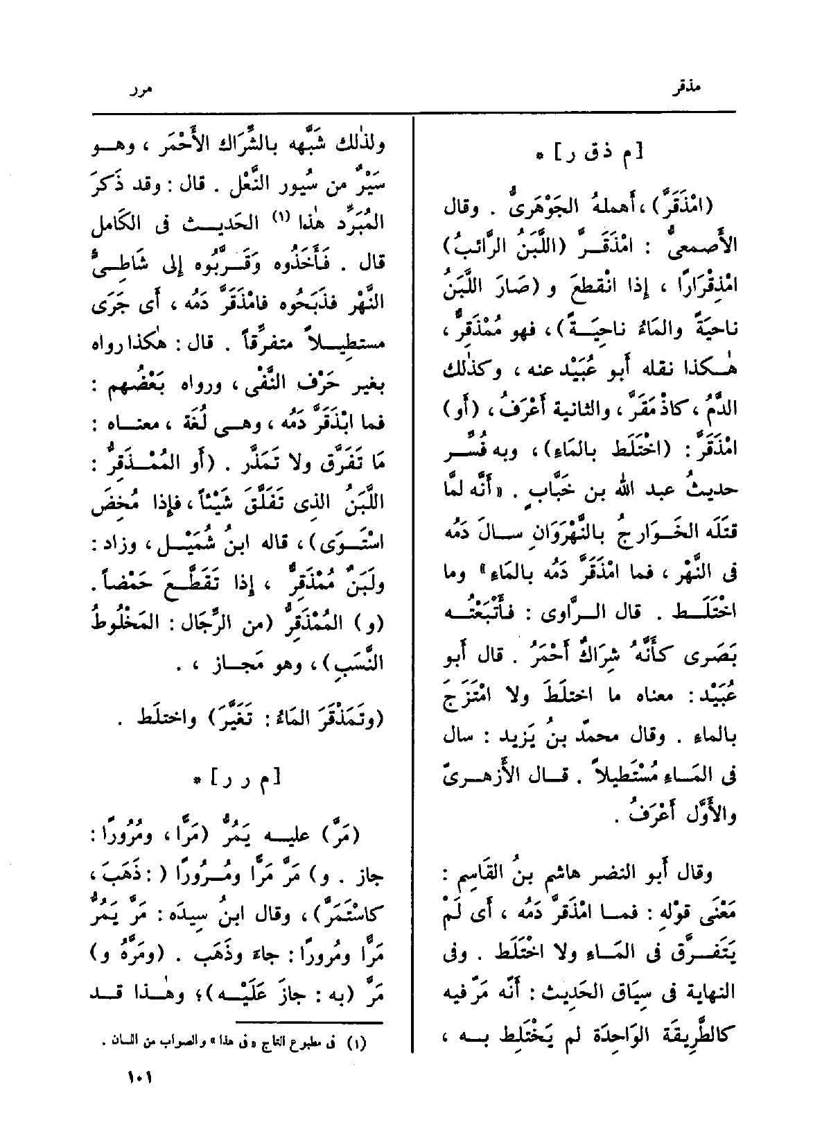 قَالَ الرَّاوِي: فأَتْبَعْتُه بَصَري كأنَّه شِراكٌ أَحْمَر. قَالَ أَبُو عُبَيْد: مَعْنَاهُ مَا اخْتَلَط وَلَا امْتَزَج بِالْمَاءِ. وَقَالَ مُحَمَّد بن يزِيد: سَالَ فِي المَاء مُستَطيلاً. قَالَ الأَزْهَرِيّ: والأوَّلُ أَعْرَف. وَقَالَ أَبُو النَّضر هَاشم بنُ الْقَاسِم: معنى قولِه: فَمَا امْذَقَرَّ دمُه، أَي لم يتفَرَّق فِي الماءِ وَلَا اخْتَلَط. وَفِي النِّهَايَة فِي سِياق الحَدِيث: أنّه مرَّ فِيهِ كالطريقةِ الواحدةِ لم يَخْتَلط بِهِ، وَلذَلِك شبَّهه بالشِّراك الْأَحْمَر، وَهُوَ سَيْرٌ من سُيور النَّعْل. قَالَ: وَقد ذَكَرَ المُبَرِّد هَذَا الحَدِيث فِي الْكَامِل قَالَ: فَأَخَذوه وقَرَّبوه إِلَى شاطئ النَّهْر فَذَبَحوه فامْذَقَرَّ دَمُه، أَي جرى مُستَطيلاً متفرِّقاً. قَالَ: هَكَذَا رَوَاهُ بِغَيْر حَرْفِ النَّفْي. وَرَوَاهُ بَعْضُهم: فَمَا ابْذَقَرَّ دَمُه، وَهِي لُغَة، مَعْنَاهُ: مَا تفرَّق وَلَا تَمَذَّر. أَو المُمْذَقِرُّ: اللَّبَنُ الَّذِي تَفَلَّق شَيْئا، فَإِذا مُخِضَ اسْتوَى، قَالَه ابنُ شُمَيْل، وَزَاد: وَلَبَنٌ مُمْذَقِرٌّ، إِذا تَقَطَّعَ حَمْضَاً. المُمْذَقِرُّ من الرِّجال: المَخْلوط النَّسَب، وَهُوَ مَجاز. وَتَمَذْقَرَ الماءُ: تغيَّر واختلَط.