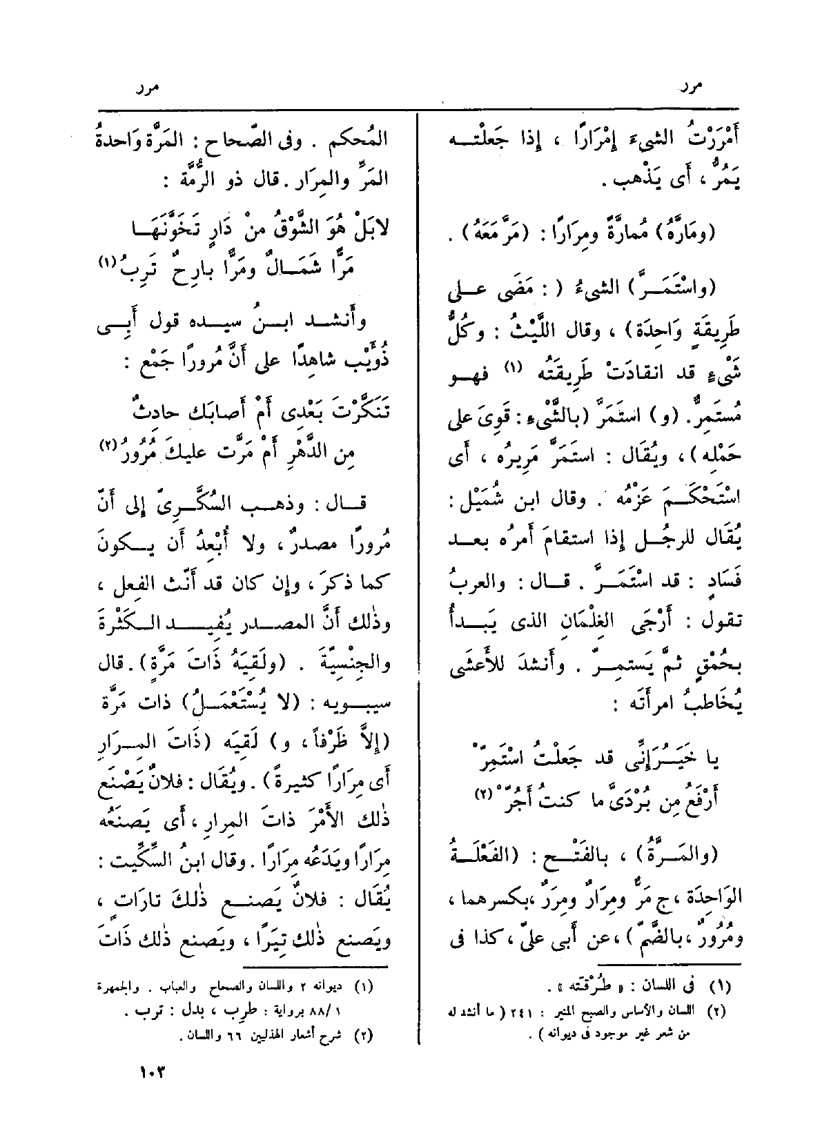 وَأنْشد ابنُ سِيدَه قَول أبي ذُؤَيْب شاهِداً على أنَّ {مُروراً جَمْع: