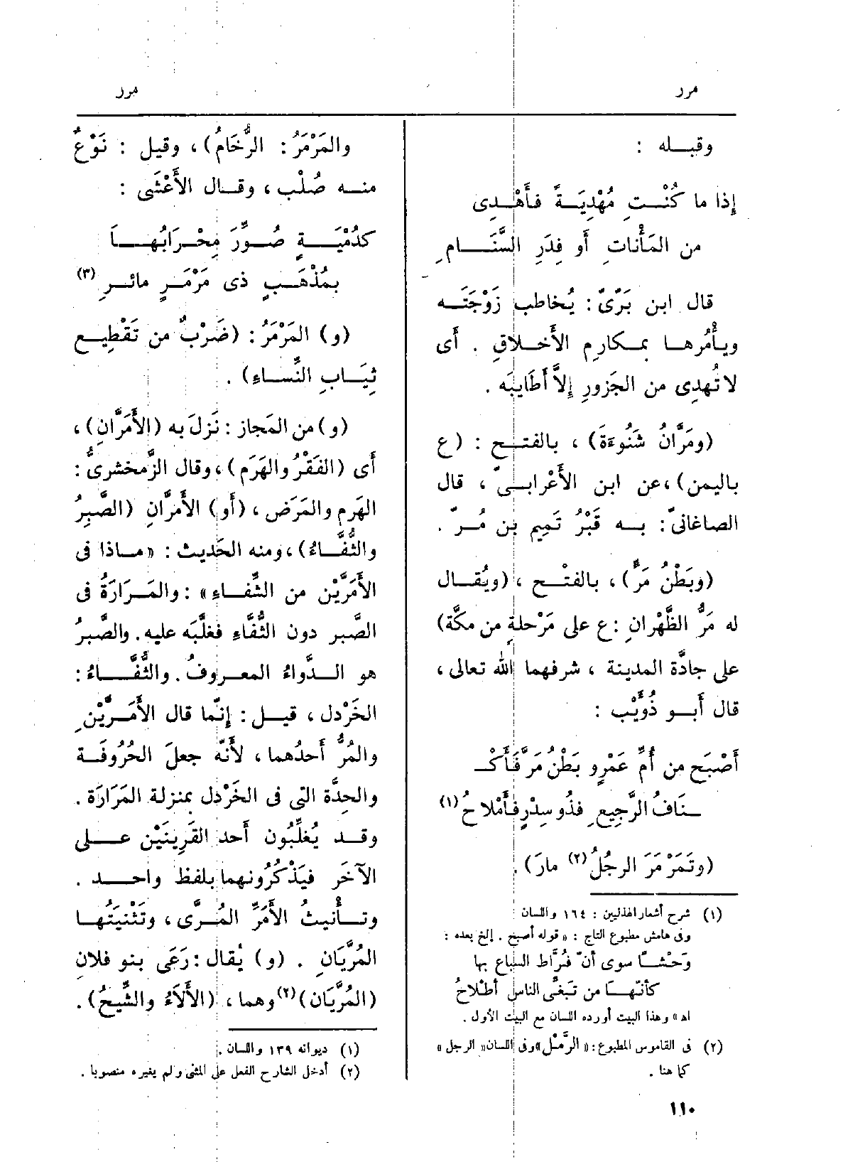 قَالَ ابنُ برِّيّ: يخاطبُ زوجتَه ويأْمرها بمكارم الْأَخْلَاق. أَي لَا تُهدي من الجَزور إلاّ أطَايبه. {ومَرَّانُ شَنُوءَة، بِالْفَتْح: ع بِالْيمن، عَن ابْن الأَعْرابِيّ، قَالَ الصَّاغانِيّ: بِهِ قَبْرُ تَميم بن مُرّ. وبَطْنُ} مَرٍّ، بِالْفَتْح، وَيُقَال لَهُ مَرُّ الظَّهْران: ع على مَرْحَلةٍ من مكَّة على جادَّة الْمَدِينَة، شرفها اللهُ تَعَالَى، قَالَ أَبُو ذُؤَيْب:)