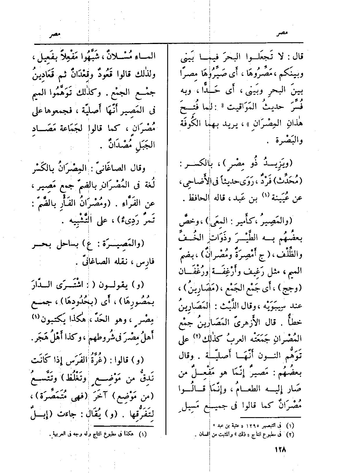 قَالَ: لَا تجْعَلُوا البحرَ فِيمَا بيني وَبَيْنكُم، مَصِّروها، أَي صَيِّروها مِصراً بَين الْبَحْر وبيني، أَي حَدّاً، وَبِه فُسِّرَ حديثُ المَواقيت: لما فُتِحَ هذانِ المِصران، يُرِيد بهما الْكُوفَة والبَصرة. ويَزيدُ ذُو مِصْرٍ، بِالْكَسْرِ: مُحَدِّث فَرْدٌ، روى حَدِيثا فِي الأَضاحي، عَن عُيَيْنَة بن عَبْد، قَالَه الْحَافِظ. والمَصيرُ كأَمير: المِعى، وخصَّ بعضُهم بِهِ الطَّيْرَ وَذَوَات الخُفِّ والظِّلْف، ج أَمْصِرَةٌ ومُصرانٌ، بضمّ الْمِيم، مثل رغيف وأَرغِفَة ورُغْفان وجج، أَي جَمْع الجَمْع، مَصارينُ، عِنْد سِيبَوَيْهٍ، وَقَالَ اللَّيْث: المَصارينُ خطأٌ. قَالَ الأَزهريّ المَصارين جمع المُصرانِ جَمَعَتْه العرَبُ كَذَلِك على توَهُّم النُّون أَنَّهَا أَصليّة. وَقَالَ بعضُهم: مصيرٌ إنَّما هُوَ مَفْعِلٌ من صَار إِلَيْهِ الطَّعامُ، وإنَّما قَالُوا مُصرانٌ كَمَا قَالُوا فِي جَمِيع مَسيلِ الماءِ مُسلانٌ، شَبَّهوا مَفْعِلاً بفَعيل، وَلذَلِك قَالُوا قَعودٌ وقِعدانٌ ثمَّ قَعادينُ جمْع الجمْع. وَكَذَلِكَ توَهَّموا الميمَ فِي المَصير أَنَّها أَصليّة، فجمعوها على مُصرانٍ، كَمَا قَالُوا لجَماعَة مَصادِ الجبلِ مُصْدانٌ. وَقَالَ الصَّاغانِيّ: المِصرانُ بِالْكَسْرِ لُغةٌ فِي المُصرانِ بالضّمّ جمع مَصير، عَن الفَرّاءِ. ومُصْرانُ الفأْرِ بالضّمّ: تَمْرٌ رديءٌ، على التَّشبيه. والمَصِيرَة: ع بساحل بَحر فَارس، نَقله الصاغانيّ. وَيَقُولُونَ: اشْترى الدَّارَ بمُصُورِها، أَي بحدودها جمع مِصرٍ، وَهُوَ الحَدّ، هَكَذَا يَكْتُبُونَ أَهلُ مصرَ فِي شروطِهم، وَكَذَا أَهلُ هَجَر. وَقَالُوا: غُرَّةُ الفَرَس إِذا كَانَت تَدِقُّ من مَوضِعٍ وتَغلُظ وتتَّسعُ من مَوضِع آخر فَهِيَ مُتَمَصِّرَة، لِتَفَرُّقِها. وَيُقَال: جاءَت إِبلُ