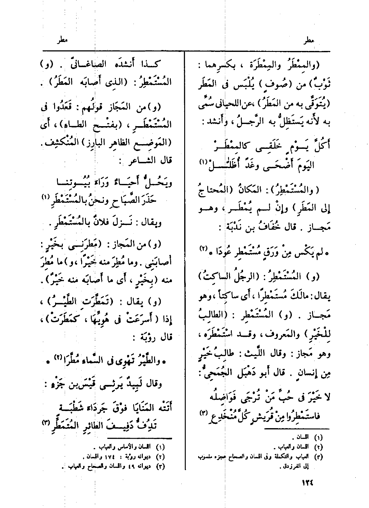 وَيُقَال: نزلَ فلانٌ بالمُستَمطَر. من الْمجَاز: مَطَرَني بِخَير: أصابني، وَمَا مُطِرَ مِنْهُ خَيْرَاً، وَمَا مُطِرَ مِنْهُ بِخَير، أَي مَا أَصَابَهُ مِنْهُ خَيْرٌ. يُقَال: تَمَطَّرَتِ الطَّيْرُ، إِذا أَسْرَعَتْ فِي هُوِيِّها، كَمَطَرتْ، قَالَ رؤبة: والطَّيْرُ تَهْوِي فِي السَّماءِ مُطَّرَا وَقَالَ لَبِيدٌ يَرْثِي قَيْسَ بن جَزْءٍ: