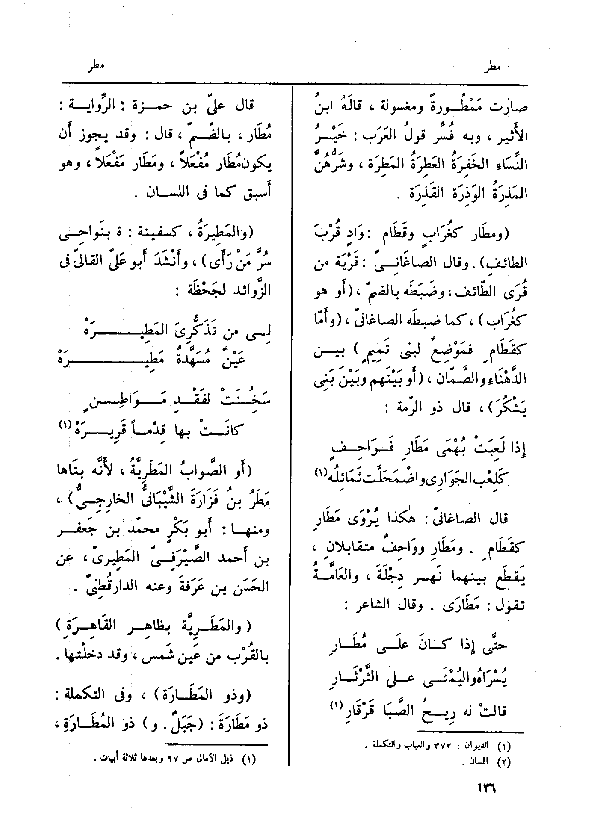 قَالَ الصَّاغانِيّ: هَكَذَا يُروى مَطَارِ كقَطام. ومَطارِ وواحِفٌ متقابلان، يقطع بَينهمَا نهر دِجْلة، والعامّةُ تَقول: مَطارى. وَقَالَ الشَّاعِر: