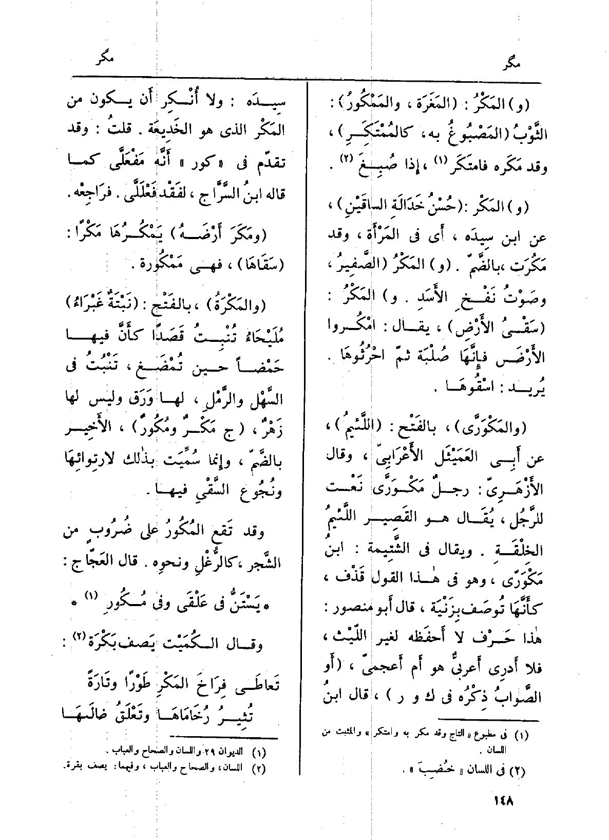 والمَكْرُ: المَغَرَةُ، والمَمْكورُ: الثوبُ المصبوغُ بِهِ، كالمُمْتَكِر، وَقد مَكَرَه فامْتَكَرَ، إِذا صُبِغَ. والمَكْرُ: حُسْنُ خَدَالَةِ السّاقينِ، عَن ابْن سِيدَه، أَي فِي المَرأَة، وَقد مَكُرَتْ، بالضّمِّ. والمَكْرُ: الصَّفيرُ، وصوتُ نَفْخِ الأَسَدِ. والمَكْرُ: سَقْيُ الأَرضِ، يُقَال: امْكُروا الأَرضَ فإنَّها صُلْبَة ثمَّ احرُثوها، يُرِيد: اسقُوها. والمَكْوَرَّى، بِالْفَتْح: اللَّئيمُ، عَن أبي العَمَيْثَل الأَعرابيّ، وَقَالَ الأَزْهَرِيّ: رجُلٌ مَكْوَرَّى نعت للرجُل، يُقَال هُوَ الْقصير اللئيمُ الخِلْقَةِ. وَيُقَال فِي الشَّتيمة: ابنُ مَكْوَرَّى، وَهُوَ فِي هَذَا القَوْل قَذْف، كأَنها توصَف بِزَنْيَة، قَالَ أَبُو مَنْصُور: هَذَا حرف لَا أَحفَظه لغير اللَّيْث، فَلَا أَدري أَعرَبيٌّ هُوَ أَم أَعجميّ، أَو الصَّواب ذِكره فِي كور، قَالَ ابْن سِيدَه: وَلَا أُنكِرُ أَن يكونَ من المَكْر الَّذِي هُوَ الخديعة، قلتُ: وَقد تقدّم فِي كَور أَنَّه مَفْعَلَّى كَمَا قَالَه ابْن السَّرّاج، لفَقْد فَعْلَلَّى. فَراجعْه. ومَكَرَ أَرْضَهُ يَمْكُرُها مَكْراً: سَقَاهَا، فَهِيَ مَمْكورة. والمَكْرَةُ، بِالْفَتْح: نَبْتَةٌ غَبراءُ مُلَيْحاءُ تُنْبِتُ قَصَداً كأَنَّ فِيهَا حَمْضاً حِين تُمْضَغ، تَنبتُ فِي السَّهل والرَّمل، لَهَا ورَق وَلَيْسَ لَهَا زَهْرٌ، ج مَكْرٌ ومُكُورٌ، الأَخير بالضَّمّ، وإنّما سُمِّيَت بذلك لارتِوائها ونُجوع السَّقي فِيهَا. وَقد تقع المُكُورُ على ضُروبٍ من الشَّجَر كالرُّغْل ونحوِه. قَالَ العجَاج: يَسْتَنُّ فِي عَلْقَى وَفِي مُكُورِ وَقَالَ الكُمَيْت يصف بَكْرَة: