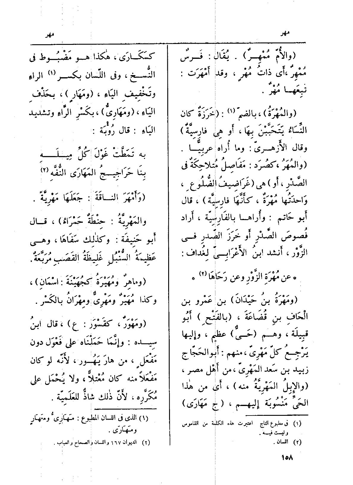 وأَمْهَر الناقةَ: جَعَلَها مَهْرِيَّةً. والمَهْرِيَّة: حِنطَةٌ حَمْرَاء، قَالَ أَبُو حنيفَة: وَكَذَلِكَ سفاها، وَهِي عظيمةُ السُّنْبُل غليظةُ القَصَب مُرَبَّعة. وماهِرٌ ومُهَيْرَة كجُهَيْنَة: اسْمان، وَكَذَا مُهَيْرٌ ومَهْرِيٌّ ومِهْران بِالْكَسْرِ. ومَهْوَرٌ، كقَسْوَر: ع، قَالَ ابنُ سِيدَه: وَإِنَّمَا حَمَلْناه على فَعْوَل دون مَفْعَلٍ، من هارَ يَهُور، لأنّه لَو كَانَ مَفْعَلاً مِنْهُ كَانَ مُعتَلاًّ، وَلَا يُحمَل على مُكَرَّرِه، لأنَّ ذَلِك شاذٌّ للعَلَمِيَّة.