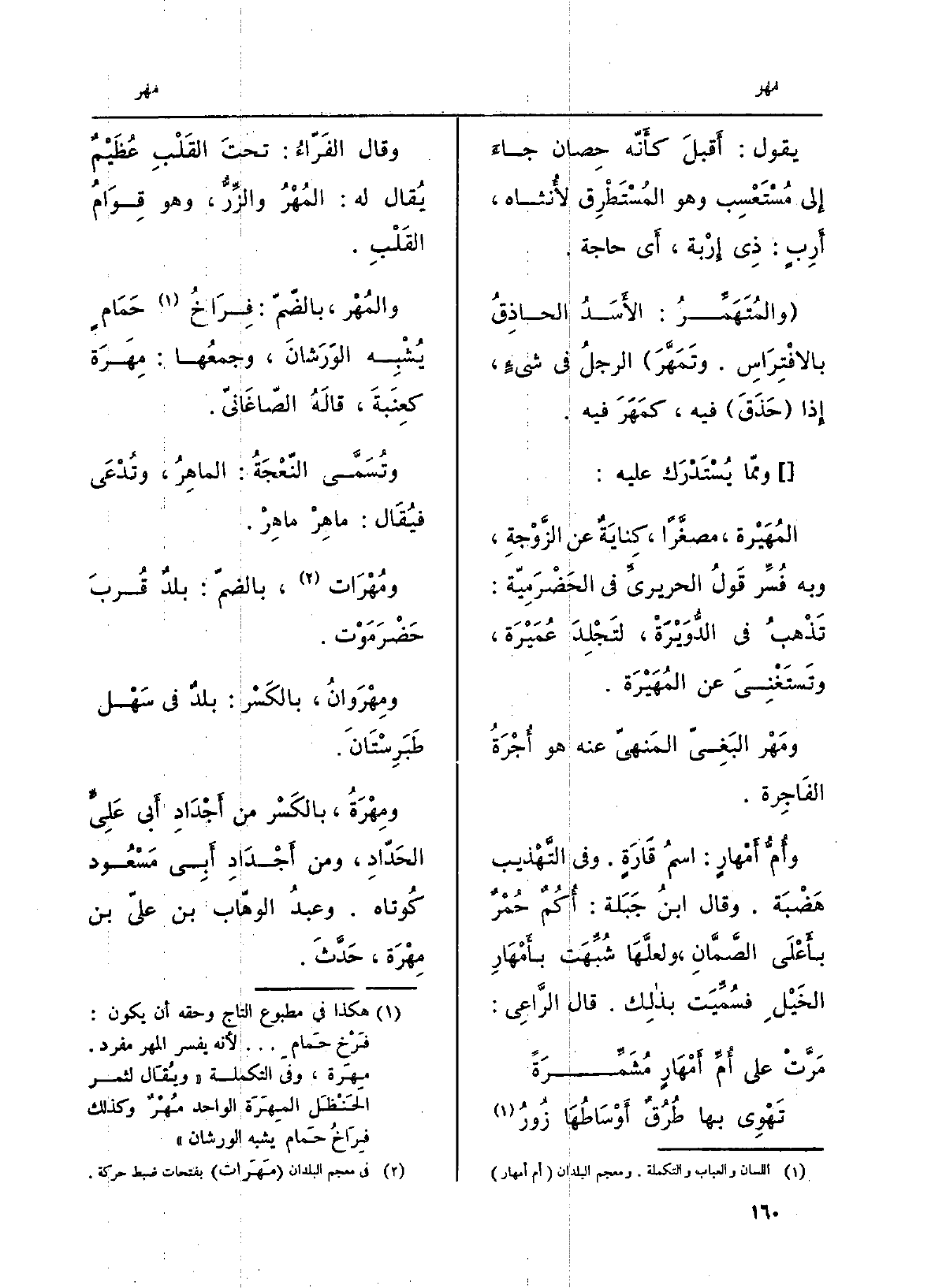 وَقَالَ الفَرَّاء: تحتَ القَلبِ عُظَيْمٌ يُقَال لَهُ: المُهْرُ والزِّرُّ، وَهُوَ قِوامُ القَلْب. والمُهْر، بالضمّ: فِراخُ حَمامٍ يُشبِه الوَرَشان، وجمعُها: مِهَرَة كعِنَبَة، قَالَه الصَّاغانِيّ. وتُسمَّى النّعجَة: الماهِرُ، وتُدعى فَيُقَال: ماهِرْ ماهِرْ. ومُهْرَات، بالضمّ: بلدٌ قُربَ حَضْرَمَوْت. ومِهْروان، بِالْكَسْرِ: بلدٌ فِي سَهْلِ طَبَرِسْتان. ومِهْرَةُ، بِالْكَسْرِ من أجدادِِ أبي عليٍّ الحَدَّاد، وَمن أَجْدَادِ أبي مَسْعُود كُوتاه. وعبدُ الوهّاب بن عليّ بن مِهْرَة، حدَّث.