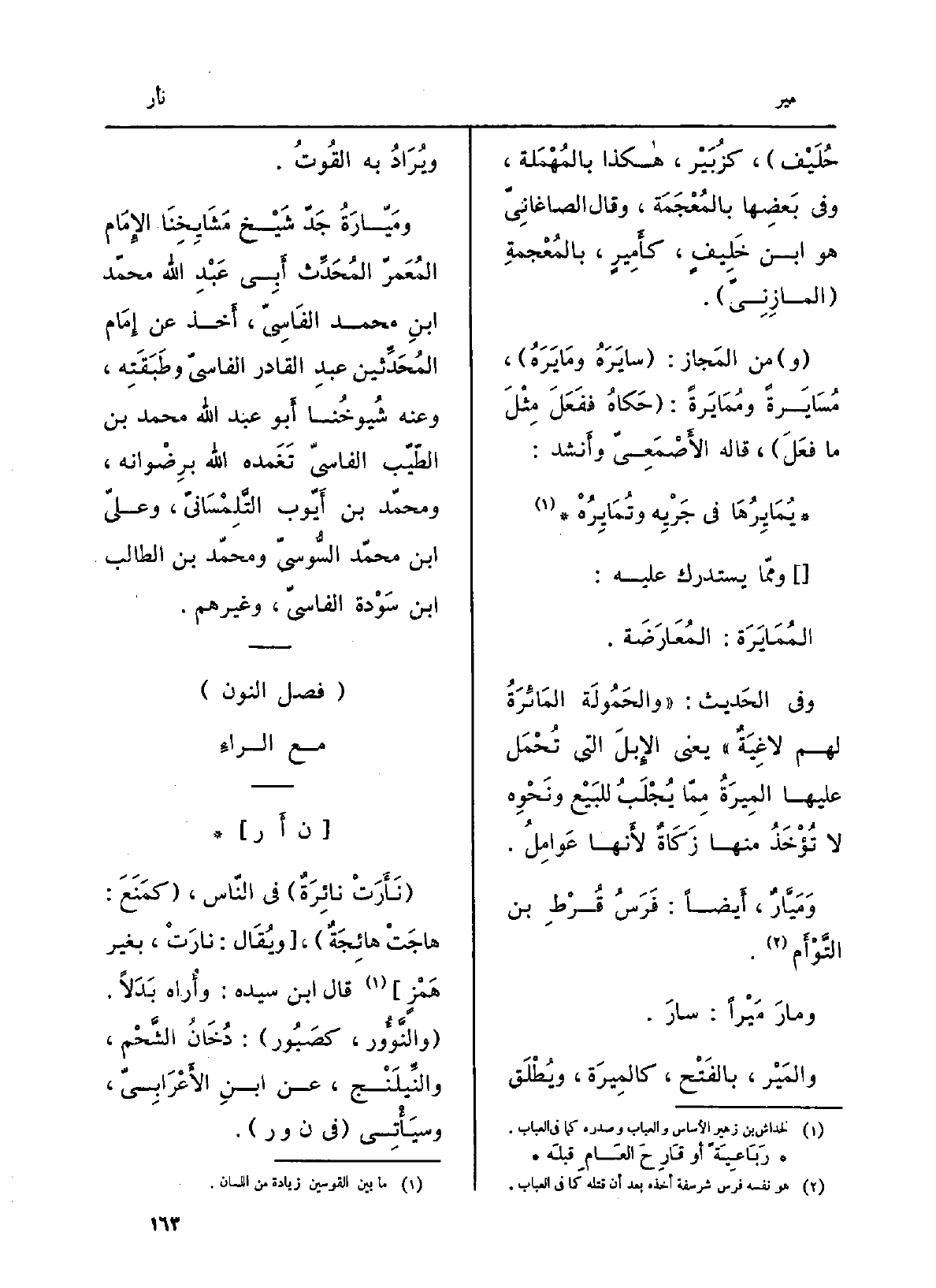 حُلَيْف، كزُبَيْر، هَكَذَا بالمُهمَلة، وَفِي بعضِها بالمُعجَمة، وَقَالَ الصَّاغانِيّ هُوَ ابْن خَليفٍ، كأميرٍ، بالمُعجَمَة المازنيّ. من المَجاز: سايَرَه {ومايَرَه، مُسايَرَةً} ومُمايَرَة: حكاهُ فَفَعَل مِثلَ مَا فَعَلَ، قَالَه الأصمَعِيُّ وَأنْشد: {يُمايِرُها فِي جَرْيِهِ} وتُمايِرُه وَمِمَّا يُستدرَك عَلَيْهِ: {المُمايَرَة: المُعارَضَة. وَفِي الحَدِيث: والحَمُولة المائِرَةُ لَهُم لاغِيَةٌ يَعْنِي الإبلَ الَّتِي تُحمَل عَلَيْهَا} المِيرَةُ ممّا يُجلَبُ للبَيْع ونَحْوِه لَا تُؤخَذ مِنْهَا زكاةٌ لِأَنَّهَا عَوامِل. {ومَيَّار، أَيْضا: فرَسٌ قُرْطِ بن التَّوْأَم.} ومارَ {مَيْرَاً: سارَ.} والمَيْر، بِالْفَتْح، {كالمِيرة، ويُطلَق ويُراد بِهِ القُوت.} ومَيَّارَةُ جَدُّ شَيْخِ مَشايِخِنا الإِمَام المُعمِّر المُحدِّث أبي عبد)