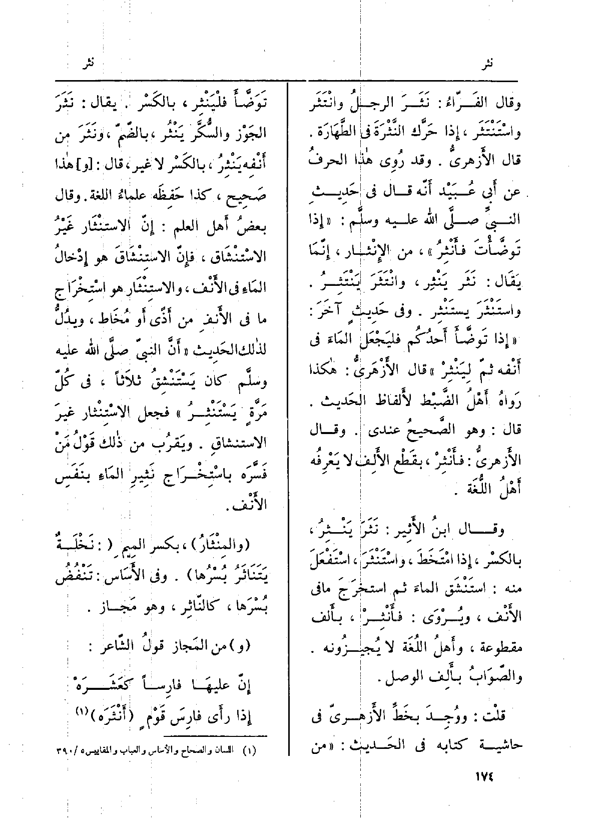 وَقَالَ الفَرَّاء: نَثَرَ الرجلُ وانْتَثَر واسْتَنْتثَر، إِذا حرَّك النَّثْرَةَ فِي الطَّهارة. قَالَ الأَزْهَرِيّ: وَقد رُوي هَذَا الحرفُ عَن أبي عُبَيْد أَنه قَالَ فِي حَدِيث النبيِّ صلّى الله عَلَيْهِ وسلَّم: إِذا تَوَضَّأْتَ فأَنْثِر، من الإنْثار، إنّما يُقَال: نَثَرَ يَنْثِر، وَنَثَر يَنْتَثِر وانْتَثَر يَسْتَنْثِر. وَفِي حديثٍ آخر: إِذا تَوَضَّأَ أحدُكم فليَجْعل الماءَ فِي أَنْفِه ثمَّ ليَنْثِرْ قَالَ الأَزْهَرِيّ: هَكَذَا رَوَاهُ أهلُ الضَّبْطِ لألفاظِ الحَدِيث. قَالَ: وَهُوَ الصَّحِيح عِنْدِي.