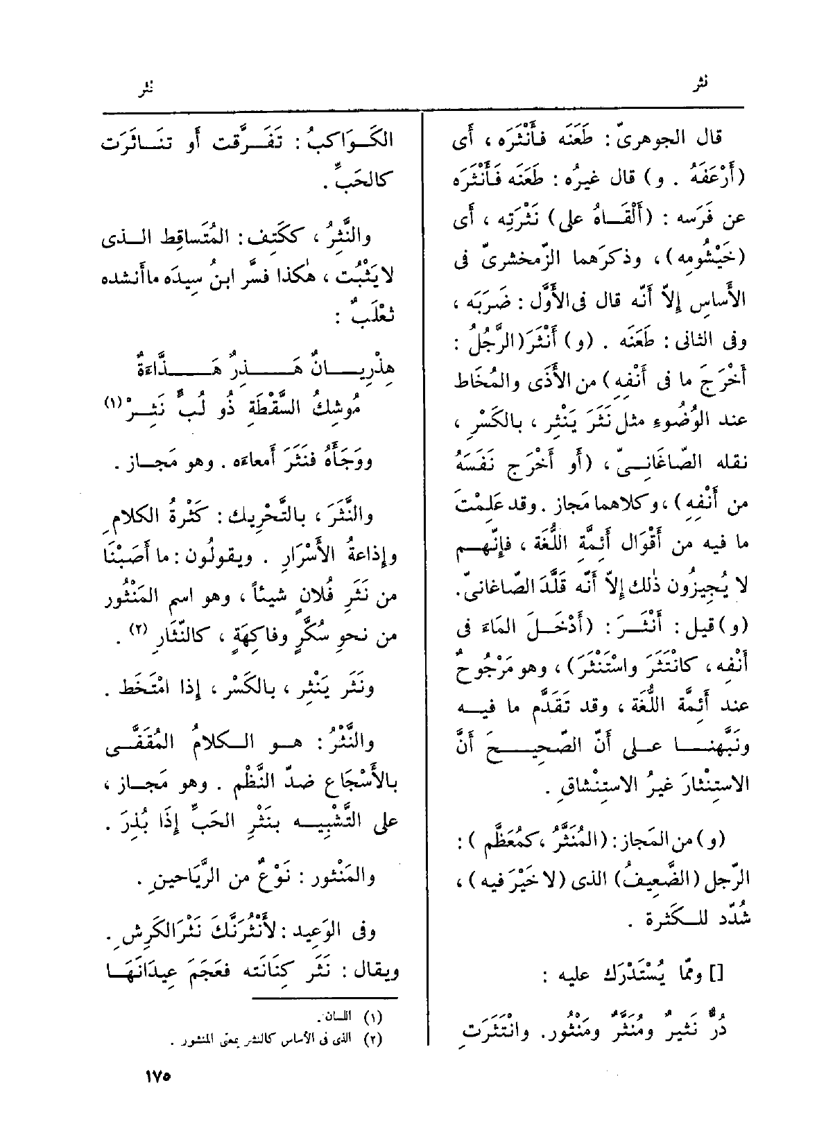 ووجَأَه فَنَثَر أمعاءَه: وَهُوَ مَجاز. والنَّثَر، بِالتَّحْرِيكِ: كَثْرَةُ الكلامِ وإذاعةُ الْأَسْرَار. وَيَقُولُونَ: مَا أَصَبْنا من نَثَرِ فلانٍ شَيْئا، وَهُوَ اسْم المَنْثور من نَحْو سُكَّرٍ وفاكِهَةٍ، كالنّثَار. وَنَثَر يَنْثِر، بِالْكَسْرِ، إِذا امْتَخَط. والنَّثْرُ: هُوَ الكلامُ المُقَفَّى بالأسْجاع ضدّ النَّظْم. وَهُوَ مَجاز، على التَّشْبِيه بنَثْرِ الحَبِّ إِذا بُذِر. والمَنْثور: نَوْعٌ من الرَّياحين. وَفِي الوَعيد: لأَنْثُرَنَّكَ نَثْرَ الكَرِشِ. وَيُقَال: نَثَرَ كِنانَتَه فَعَجَم عِيدانَها