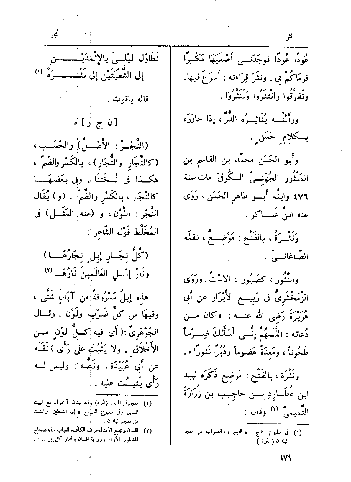 عُوداً عُوداً فَوَجَدني أَصْلَبَها مَكْسِراً فرماكمْ بِي. وَنَثَر قِراءَته: أَسْرَع فِيهَا. وتفرَّقوا وانْتَثَروا وتَنَثَّروا. ورأيتُه يُناثِره الدُّرَّ، إِذا حاورَه بكلامٍ حسنٍ. وَأَبُو الْحسن مُحَمَّد بن الْقَاسِم بن المَنْثور الجُهَنِيّ الكُوفيّ مَاتَ سنة وابنُه أَبُو طاهرٍ الحَسَن، روى عَنهُ ابنُ عَسَاكِر. وَنَثْرَةُ، بِالْفَتْح: مَوْضِعٌ، نَقله الصَّاغانِيّ. والنَّثُور، كصَبُور: الاسْت. وروى الزَّمَخْشَرِيّ فِي ربيع الْأَبْرَار عَن أبي هُرَيْرةَ رَضِي الله عَنهُ: كَانَ من دُعائِه: اللَّهُمَّ إنّي أسأَلُك ضِرْساً طَحُوناً، ومَعِدَةً هَضوماً ودُبُراً نَثُوراً. وَنَثْرة، بِالْفَتْح: مَوْضِع ذَكَرَه لبيد بنُ) عُطارِدِ بن حاجِب بن زُرارة التَّميميّ وَقَالَ: