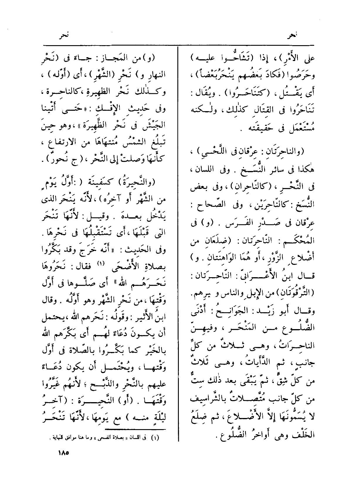 إِذا تَشاحُّوا عَلَيْهِ وَحَرَصوا فكادَ بَعْضُهم يَنْحَرُ بَعْضَاً، أَي يَقْتُل، كَتَنَاحروا. وَيُقَال: تَناحَروا فِي القِتالِ كَذَلِك، وَلكنه مُستَعمَل فِي حَقِيقَته. والناحِرَتان: عِرْقان فِي اللَّحْيِ، هَكَذَا فِي سَائِر النُّسَخ. وَفِي اللِّسَان، فِي النَّحْر، كالنَّاحِران، وَفِي بعضِ النّسخ: كالنَّاحِرَيْن، وَفِي الصّحاح: عِرْقان فِي صَدْرِ الفَرَس. فِي المُحكَم: النَّاحِرَتان: ضِلْعان من أضْلاعِ الزَّوْر، أَو هما الواهِنَتان. وَقَالَ ابْن الأَعْرابِيّ: الناَّحِرَتان: التَّرْقُوَتان من الإبلِ والناسِ وَغَيرهم. وَقَالَ أَبُو زَيْد: الجَوانِحُ: أَدْنَى الضُّلوع من المَنْحَر، وفيهِنّ الناحِرات، وَهِي ثلاثٌ من كلِّ جَانب، ثمَّ الدَّأَيات، وَهِي ثلاثٌ من كلِّ شِقٍّ، ثمَّ يبْقى بعدَ ذَلِك سِتٌّ من كلِّ جَانب مُتَّصِلاتٌ بالشَّراسيف لَا يُسمُّونَها إلاَّ الأَضْلاع، ثمَّ ضِلَعُ الخَلْف وَهِي أواخرُ الضُّلوع. منَ المَجاز: جاءَ فِي نَحْرِ النهارِ ونَحْرِ الشَّهْرِ، أَي أولِه، وَكَذَلِكَ نَحْر الظهيرة، كالناحِرة، وَفِي حَدِيث الْإِفْك: حَتَّى أَتَيْنا الجيشَ فِي نَحْرِ الظَّهيرة، وَهُوَ حينَ تَبْلُغ الشمسُ مُنتهاها من الِارْتفَاع، كَأَنَّهَا وصلتْ إِلَى النَّحْر، ج نُحور. والنَّحيرة كسَفينة: أوّلُ يومٍ من الشَّهْر أَو آخِره، لأنّه يَنْحَر الَّذِي يَدْخُل بَعْدَه. وَقيل: لأنّها تَنْحَر الَّتِي قَبْلَها، أَي تَسْتَقْبِلُها فِي نَحْرِها. وَفِي الحَدِيث: أنّه خرجَ وَقد بَكَّروا بصلاةِ الْأَضْحَى فَقَالَ: نَحَروها نَحَرَهُم الله أَي صَلُّوها فِي أوّل وَقْتِها، من نَحْرِ الشهرِ وَهُوَ أوّلُه. وَقَالَ ابنُ الْأَثِير: وقولُه: نَحَرَهم الله، يحْتَمل أَن يكون دُعاءً لَهُم أَي بَكَّرَهم الله بِالْخَيرِ كَمَا بَكَّروا بِالصَّلَاةِ فِي أوّل وَقْتِها، ويُحتمل أَن يكون دُعَاء عَلَيْهِم بالنَّحْر والذَّبْح لأنّهم غَيَّروا وَقْتَها. أَو النَّحِيرة: آخِرُ ليلةٍ مِنْهُ مَعَ يَوْمِها، لأنّها تَنْحَر