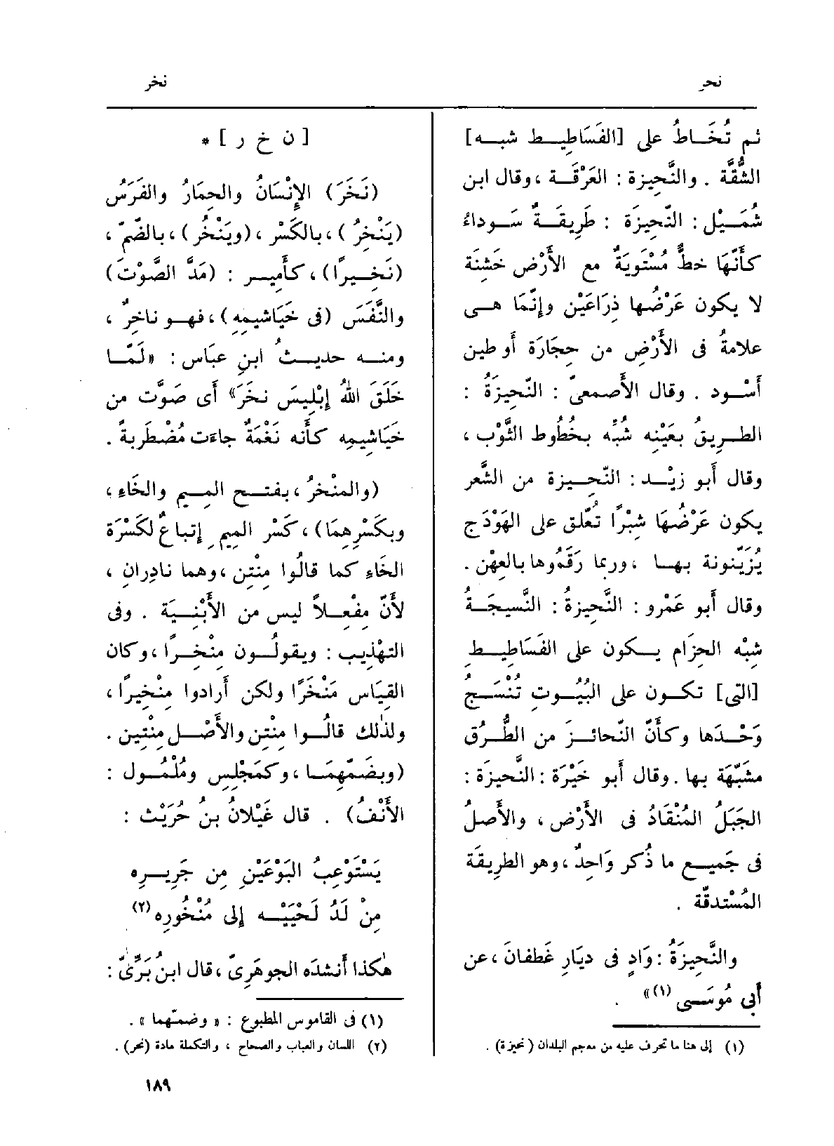 ثمَّ تُخاط على الفساطيط شبه الشُّقَّة. والنَّحيزة: العَرْقَة، وَقَالَ ابنُ شُمَيْل: النّحيزة: طريقةٌ سوداءُ كأنّها خطٌّ مُستَوِيَة مَعَ الأَرْض خَشِنَة لَا يكون عَرْضُها ذِراعَيْن وإنّما هِيَ عَلامَة فِي الأَرْض من حِجَارَة أَو طين أَسْوَد. وَقَالَ الأصمعيّ: النَّحيزة: الطريقُ بعَيْنِه شُبِّه بخطوط الثَّوْب، وَقَالَ أَبُو زَيْد: النَّحيزة من الشَّعر يكون عَرْضُها شِبراً تُعلّق على الهَوْدَج يُزَيّنونه بهَا. وَرُبمَا رقَموها بالعِهْن. وَقَالَ أَبُو عَمْرُو: النَّحيزة: النَّسيجةُ شِبه الحِزام يكون على الفساطيطِ الَّتِي تكون على الْبيُوت تُنسَج وَحْدَها وكأنّ النّحائزَ من الطُّرُق مشَبّهة بهَا. وَقَالَ أَبُو خَيْرَة: النَّحيزة: الجبلُ المُنْقاد فِي الأَرْض، والأصلُ فِي جَمِيع مَا ذُكر واحدٌ، وَهُوَ الطَّرِيقَة المُسْتدقّة. والنَّحيزة: وادٍ فِي ديار غَطَفَان، عَن أبي مُوسَى.