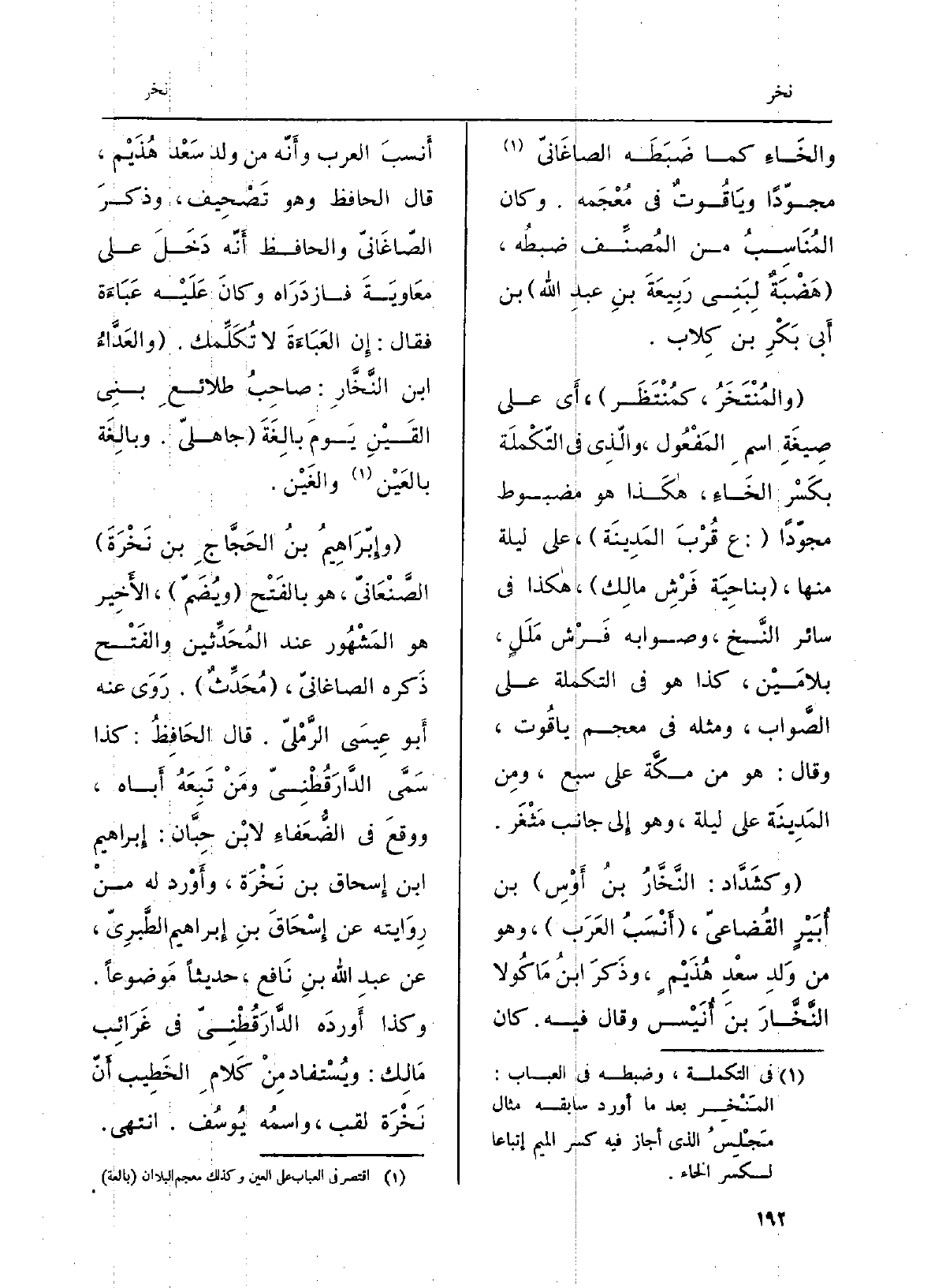 والخاءِ كَمَا ضَبَطَه الصَّاغانِيّ مجوّداً وياقوتٌ فِي مُعجَمِه. وَكَانَ المٌ ناسبُ من المُصنِّف ضَبْطُه، هَضْبَةٌ لبَني رَبيعةَ بنِ عبد الله بن أبي بكر بن كِلاب. والمُنْتَخِر، كمُنْتَظِر، أَي على صِيغةِ اسمِ الْمَفْعُول، وَالَّذِي فِي التَّكْمِلة بِكَسْر الْخَاء، هَكَذَا هُوَ مضبوط مجوّداً: ع قُربَ الْمَدِينَة، على لَيْلَة مِنْهَا، بناحيةِ فَرْشِ مالِك، هَكَذَا فِي سَائِر النّسخ، وَصَوَابه فَرْش مَلَلٍ، بلامَيْن، كَذَا هُوَ فِي التكملة على الصَّوَاب، وَمثله فِي مُعْجم ياقوت، وَقَالَ: هُوَ من مَكَّة على سبع، وَمن الْمَدِينَة على لَيْلَة، وَهُوَ إِلَى جَانب مَثْغَر. وكشَدَّاد: النَّخَّارُ بنُ أَوْسِ بن أُبَيْرٍ القُضاعيّ، أَنْسَبُ الْعَرَب، وَهُوَ من وَلدِ سعدِ هُذَيْم، وَذكر ابْن مَاكُولَا النَّخَّار بن أُنَيْس وَقَالَ فِيهِ: كَانَ أنسب الْعَرَب وأنّه من ولد سعد هُذَيْم، قَالَ الْحَافِظ وَهُوَ تَصْحِيف، وذكرَ الصَّاغانِيّ والحافظ أنّه دخلَ على معاويةَ فازْدَراه وَكَانَ عَلَيْهِ عَباءَة فَقَالَ: إِن العباءَةَ لَا تُكَلِّمك. والعَدَّاءُ بن النَّخَّار: صاحبُ طلائعِ بني القَيْنِ يومَ بالِغَةَ جاهليّ. وبالِغَة بالعَيْن والغَيْن. وَإِبْرَاهِيم بنُ الحَجَّاج بن نَخْرَة الصَّنْعانيّ، هُوَ بِالْفَتْح ويُضمّ، الْأَخير هُوَ الْمَشْهُور عِنْد المُحدِّثين وَالْفَتْح ذكره الصَّاغانِيّ، مُحدِّث. روى عَنهُ أَبُو عِيسَى الرَّمْليّ. قَالَ الْحَافِظ: كَذَا سمَّى الدَّارَقُطْنيّ وَمَنْ تَبِعَه أَبَاهُ، ووقعَ فِي الضُّعَفاء لِابْنِ حِبَّان: إِبْرَاهِيم بن إِسْحَاق بن نَخْرَة، وَأورد لَهُ من رِوَايَته عَن إِسْحَاق بن إِبْرَاهِيم الطَّبريّ، عَن عبد الله بن نَافِع، حَدِيثا مَوْضُوعا.