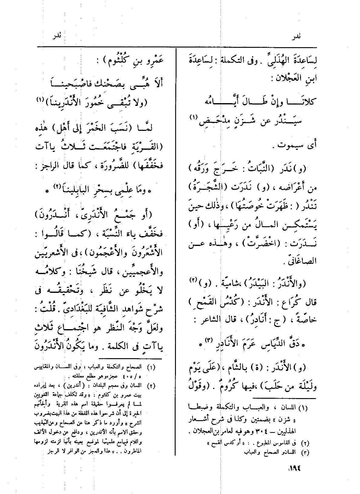 لمّا نَسَبَ الخمرَ إِلَى أهلِ هَذِه القريةِ فاجتمَعَتْ ثلاثُ ياآت فخَفَّفَها للضَّرُورَة، كَمَا قَالَ الراجز: وَمَا عِلْمي بسِحْرِ البابِلينا أَو جَمْعُ الأَنْدَريّ، أَنْدَرون فخفَّفَ ياءَ النِّسبة، كَمَا قَالُوا: الأَشْعَرون والأَعْجَمون، فِي الأَشعريّين والأَعجميِّين، قَالَ شَيْخُنا: وكلامُه لَا يَخْلُو عَن نَظَر، وتَحقيقُه فِي شرحِ شَواهدِ الشافِيَة للبغداديّ. قلتُ: ولعلَّ وَجْهَ النّظر هُوَ اجتِماع ثلاثِ ياآتٍ فِي الْكَلِمَة. وَمَا يكون الأَنْدَرون
