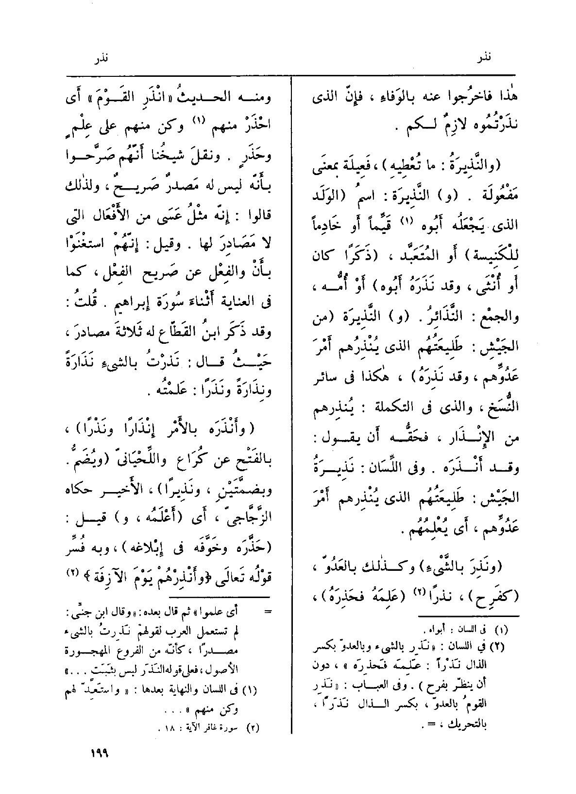 والنَّذيرةُ: مَا تُعْطيه، فَعيلَة بِمَعْنى مَفعُولَة. والنَّذيرة: اسمُ الولَد الَّذِي يجعلُهُ أَبوه قَيِّماً أَو خادِماً للكنيسة أَو المُتَعَبَّد، ذَكَراً كَانَ أَو أُنْثى، وَقد نَذَرَهُ أَبوه أَو أُمُّه، وَالْجمع: النَّذائرُ. النَّذيرةُ من الجَيْشِ: طليعَتُهم الَّذِي يُنْذِرُهم أَمْرَ عَدُوِّهم، وَقد نَذِرَهُ، هَكَذَا فِي سَائِر النَّسخ، وَالَّذِي فِي التكملة: يُنذِرهم من الْإِنْذَار، فحَقُّه أَن يَقُول: وَقد أَنذَرَه. وَفِي اللِّسَان: نَذيرةُ الْجَيْش: هم الَّذِي ينذرهم أمرَ عّدُوِّهم، أَي يُعْلِمُهم. ونَذِرَ بالشَّيءِ وَكَذَلِكَ بالعَدوّ، كفَرِح، نذرا عَلِمَهُ فَحَذِرَهُ، وَمِنْه الحَدِيث أَنْذِرِ القَوْمَ أَي احْذَرْ مِنْهُم وَكن مِنْهُم على عِلْمٍ وحَذَرٍ. ونقلَ شيخُنا أَنَّهم صَرَّحوا بأَنَّه لَيْسَ لَهُ مَصْدَرٌ صريحٌ، وَلذَلِك قَالُوا: إنَّه مثلُ عَسى من الأَفعال الَّتِي لَا مَصادِرَ لَهَا. وقيلَ إنَّهم استَغْنَوا بأَنْ والفِعْل عَن صَرِيح)