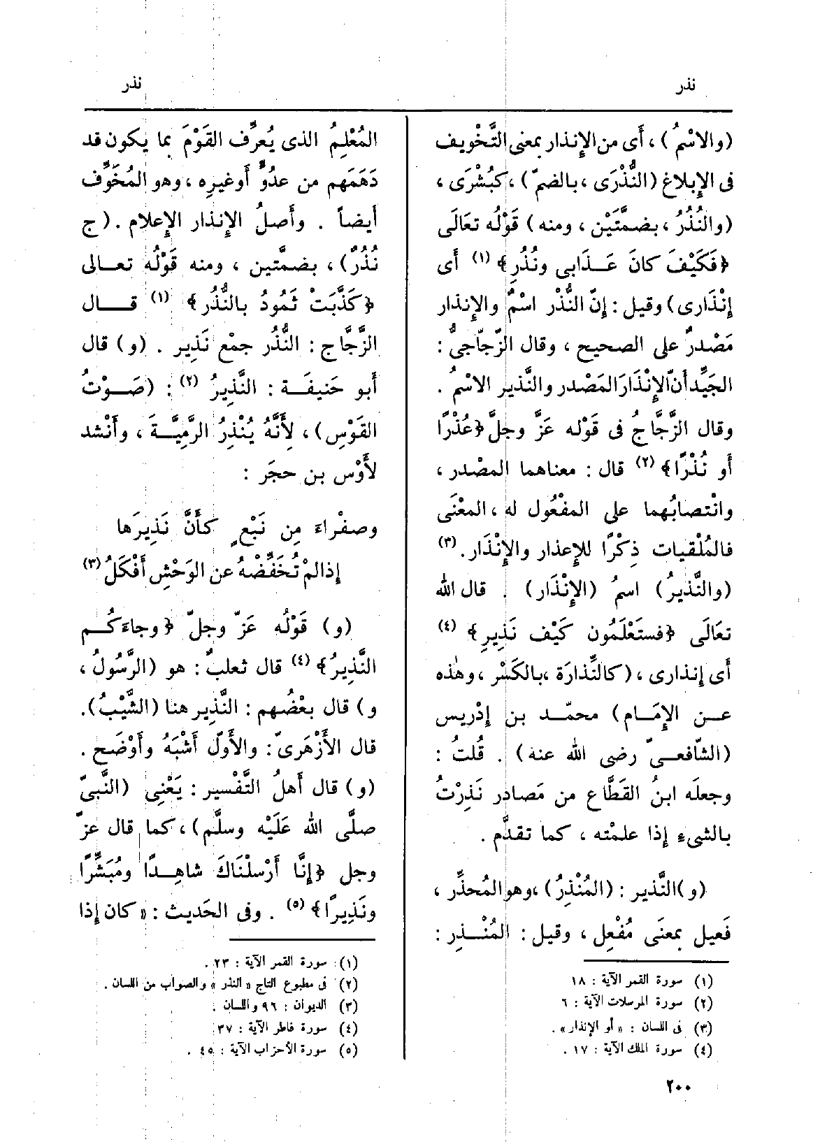 ِ والاسمُ، أَي من الْإِنْذَار بِمَعْنى التَّخويف فِي الإبلاغ، النُّذْرَى، بالضّم، كبُشرى، والنُّذُرُ، بضمَّتين، وَمِنْه قَوْله تَعَالَى: فكيفَ كانَ عَذابي ونُذُرِ أَي إنذاري، وَقيل: إنَّ النُّذْرَ اسمٌ والإنذارُ مَصْدَرٌ على الصَّحِيح، وَقَالَ الزّجاجيُّ: الجيِّد أَنَّ الإنْذارَ الْمصدر والنَّذير الِاسْم. وَقَالَ الزَّجّاج فِي قَوْله عزّ وجلّ عُذراً أَو نُذراً قَالَ مَعْنَاهُمَا الْمصدر، وانتصابهما على الْمَفْعُول لَهُ، الْمَعْنى فالمُلْقيات ذِكراً للإعذار والإنذار. قَالَ الله تَعَالَى فستعلمونَ كيفَ نَذِيرِ، أَي إنذاري، كالنَّذارة، بِالْكَسْرِ، وَهَذِه عَن الإِمَام مُحَمَّد بن إِدْرِيس الشَّافِعيّ رَضِي الله عَنهُ. قلتُ: وَجعله ابْن القطّاع من مصَادر نَذِرْتُ بالشيءِ إِذا علمْته، كَمَا تقدَّم. النَّذير: المُنْذِرُ، وَهُوَ المُحّذِّر، فَعِيل بِمَعْنى مُفْعِل، وَقيل: المُنْذِر: المُعْلِم الَّذِي يُعَرِّف القومَ بِمَا يكون قد دهمهم من عَدُوٍّ أَو غَيره، وَهُوَ المُخَوِّف أَيضاً. وأَصل الْإِنْذَار الْإِعْلَام. ج نُذُرٌ، بضمَّتين، وَمِنْه قَوْله تَعَالَى كَذَّبَتْ ثَمودُ بالنُّذُر، قَالَ الزَّجّاج: النُّذُر جمع نَذير. قَالَ أَبُو حنيفَة: النَّذيرُ: صَوتُ القوسِ، لأَنَّه يُنْذِرُ الرَّمِيَّةَ، وأَنشدَ لأَوسِ بن حجَر: