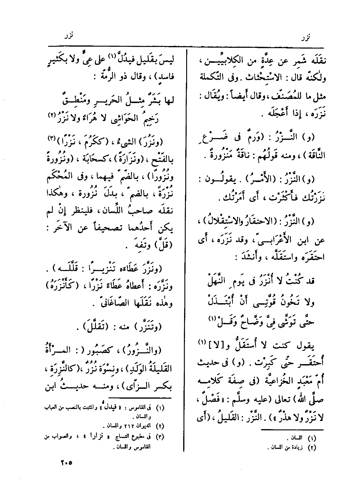 حتّى تَوَشَّى فِيَّ وَضّاحٌ وَقَلْ يَقُول كنت لَا أُستَقَلُّ وَلَا أُحتَقَر حتّى كَبِرْت. فِي حَدِيث أُمِّ مَعْبَدٍ الخُزاعِيَّة فِي صفة كَلَامه صلى الله تَعَالَى عَلَيْهِ وسلّم: فَصْلٌ، لَا نَزْرٌ وَلَا هذْرٌ. النَّزر: القليلُ، أَي لَيْسَ بِقَلِيل فيدلُّ على عِيٍّ وَلَا بكثيرٍ فاسدٍ، وَقَالَ ذُو الرُّمَّة: