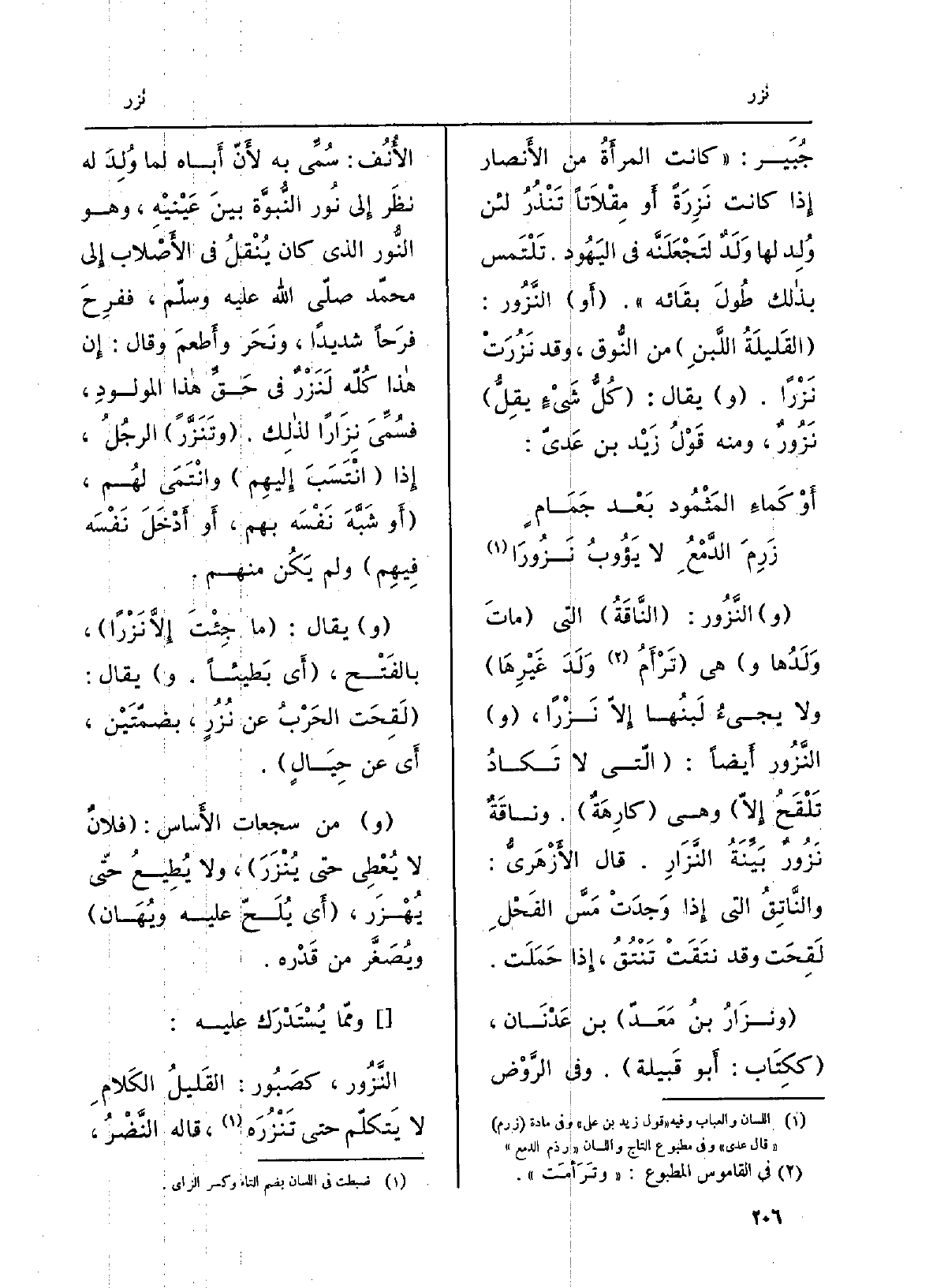 جُبَيْر: كَانَت المرأَة من الأَنصار إِذا كَانَت نَزِرَةً أَو مِقلاتاً تَنْذُرُ لِمَن وُلِدَ لَهَا وَلَدٌ لَتَجْعَلَنَّه فِي الْيَهُود. تلتمس بذلك طولَ بَقَائِهِ. أَو النَّزور: القليلة اللبنِ من النُّوق، وَقد نَزُرَتْ نَزْراً. يُقَال: كلُّ شيءٍ يَقِلُّ نَزورٌ، وَمِنْه قَول زيد بن عَديّ: