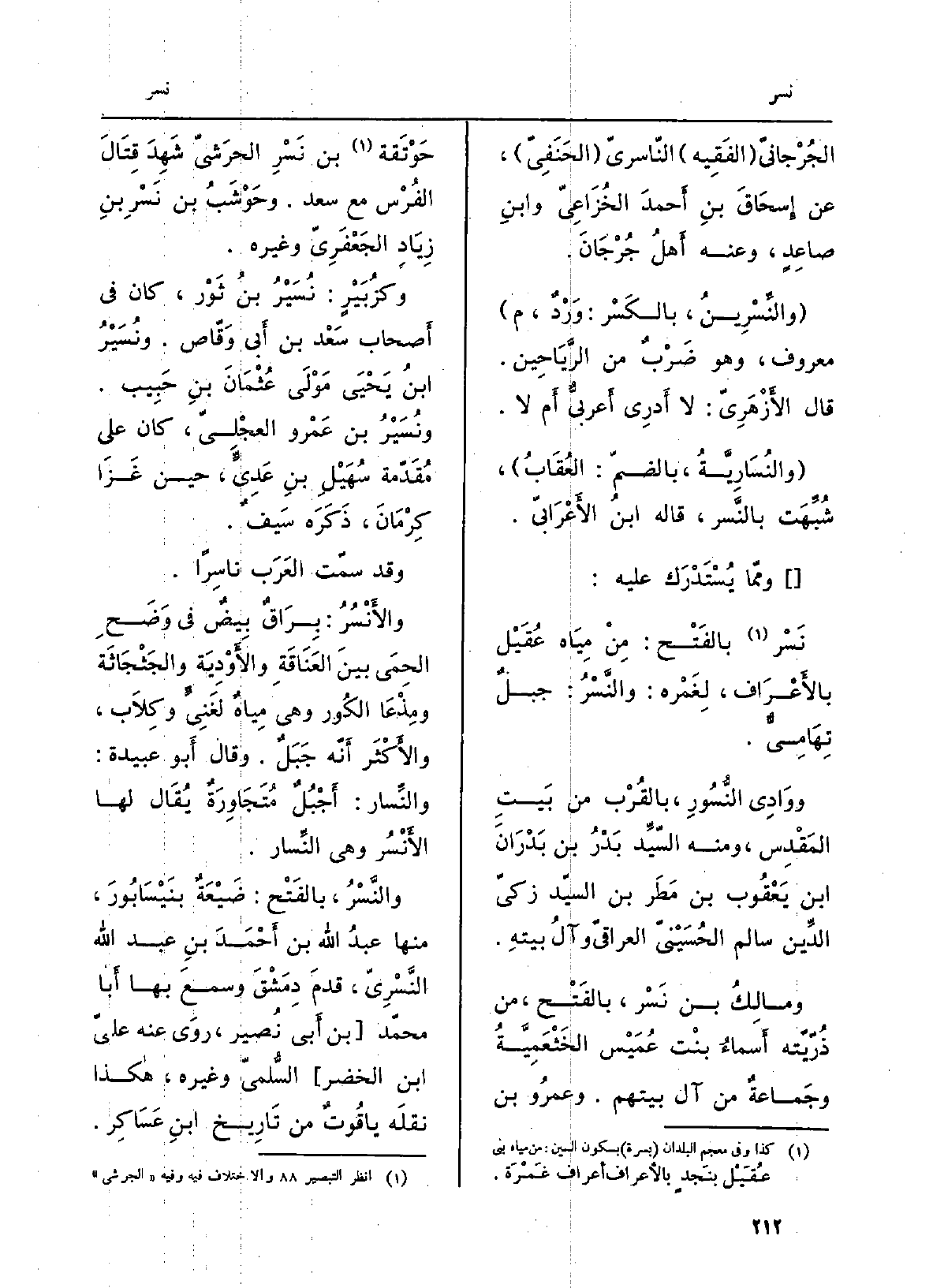 الجُرجانيّ الْفَقِيه النّاسِريّ الحَنَفيّ، عَن إسحاقَ بن أَحمدَ الخُزاعِيّ وابنِ صاعِدٍ، وَعنهُ أَهلُ جُرجانَ. والنِّسْرِينُ: بالكَسر: وَرْدٌ، م مَعْرُوف، وَهُوَ ضَرْبٌ من الرَّياحين، قَالَ الأَزْهَرِيّ: لَا أَدري أَعَربيٌّ أَمْ لَا. والنُّسارِيَّةُ، بالضَّمّ: العُقابُ، شُبِّهَتْ بالنَّسر، قَالَه ابْن الأَعرابيّ. وَمِمَّا يسْتَدرك عَلَيْهِ: نَسْر بِالْفَتْح: من مياه عُقَيْل بالأَعراف، لِغَمْرِه. والنَّسْرُ: جبَلٌ تِهامِيٌّ. ووَادي النُّسورِ، بِالْقربِ من بَيت المَقدِس، وَمِنْه السَّيِّد بدْرُ بن بَدرانَ بن يَعْقُوب بن مَطَر بن السَّيّد زكيّ الدّين سَالم الحُسَيْنيّ العراقيّ وآلُ بيتِه. ومالكُ بن نَسْر، بِالْفَتْح، من ذُرّيَّته أَسماءُ بنتُ عُمَيْس الخَثْعَمِيَّةُ وجماعةٌ من آل بَيتهمْ. وَعَمْرو بن حَوْتَقة بن نَسْرِ الحرَشيّ شهدَ قتالَ الفُرْس مَعَ سَعد، وحَوْشَبُ بن نَسْرِ بنِ زيادٍ الجَعفريّ وَغَيره. وكَزُبَيْرٍ: نُسَيْرُ بنُ ثَوْر، كَانَ فِي أَصحاب سعد بن أبي وقّاص، ونُسَيْرُ بن يحيى مَولى عثمانَ بن حبيب، ونُسَيْر بن عَمْرو العجْليّ، كَانَ على مقدّمة سُهَيْلِ بنِ عَدِيٍّ، حِين غَزا كِرْمانَ، ذَكَرَه سَيفٌ. وَقد سَمَّت الْعَرَب ناسراً. والأّنْسُرُ: بِراقٌ بيضٌ فِي وضَحِ الحِمى بَين العَناقَةِ والأَودية والجَثْجَاثَة ومِذعا الكُور وَهِي مِياهٌ لِغَنِيٍّ وكِلاب، والأَكثرُ أَنَّه جبلٌ. وَقَالَ أَبُو عُبَيْدَة: والنِّسارُ: أَجْبُلٌ متجاورَةٌ يُقَال لَهَا الأَنْسُرُ وَهِي النِّسار. والنَّسْرُ، بِالْفَتْح: ضيعةٌ بنَيْسابُورَ، مِنْهَا عبد الله بن أَحمد بن عبد الله النَّسْرِيّ، قدِم دمشقَ وسَمع بهَا أَبا محمّد بن أَبي نُصيْر، رَوى عَنهُ عليّ بن الْخضر السُّلميّ وَغَيره، هَكَذَا نقلَه ياقوتٌ من تَارِيخ ابنِ عَسَاكِر.