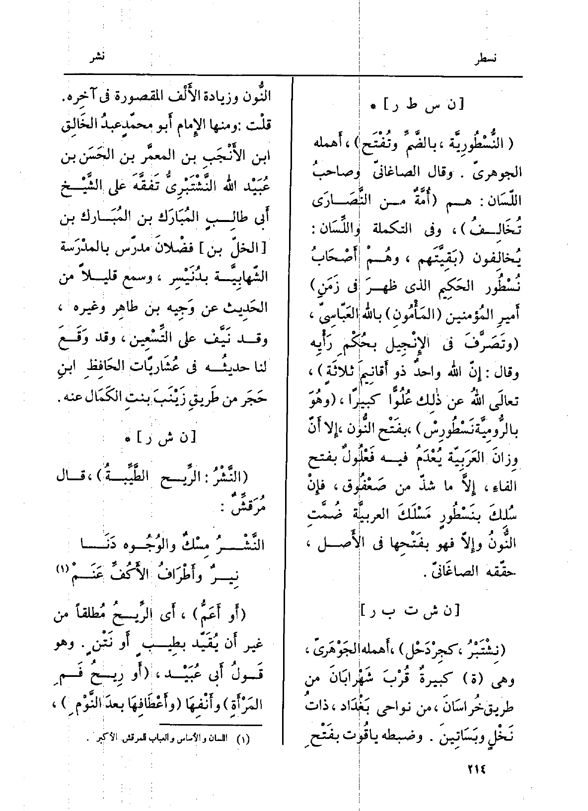 نِشْتَبْرُ، كجِرْدَحْل، أَهمله الجَوْهَرِيّ، وَهِي ة كبيرةٌ قربَ شَهرابانَ من طَرِيق خُراسانَ، من نواحي بَغداد، ذاتُ نَخلٍ وبساتينَ. وضبطَه ياقوت بِفَتْح النُّون وَزِيَادَة الأَلف الْمَقْصُورَة فِي آخِره. قلت: وَمِنْهَا الإمامُ أَبو محمّد عبدُ الْخَالِق بن الأَنْجَب بن المُعمَّر بن الحسَن بن عُبَيْد الله النَّشْتَبْرِيُّ تفقَّه على الشَّيْخ أَبي طالبٍ المُبارك بن المُبارَك بن الخلّ بن فَضلانَ مدرِّس بِالْمَدْرَسَةِ الشّهابيّة بدُنَيْسِر، وَسمع قَلِيلا من الحَدِيث عَن وجيه بن طَاهِر وَغَيره، وَقد نيَّفَ على التِّسعين، وَقد وقَعَ لنا حديثُه فِي عُشارِيّات الحافظِ بنِ حَجَر من طريقِ زَيْنَبَ بنتِ الكَمالِ عَنهُ.