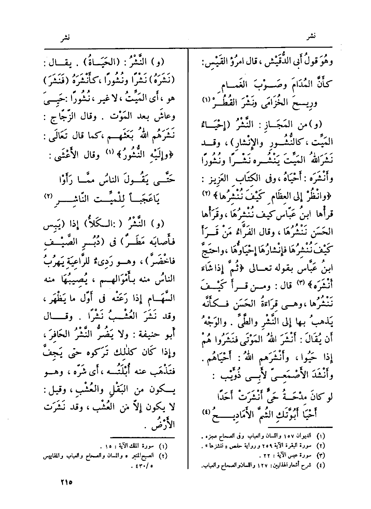من المَجاز: النَّشْرُ إحياءُ المَيِّت، كالنُّشورِ والإنشارِ، وَقد نشَرَ اللهُ المَيِّتَ ينشُره نَشْراً ونُشوراً وأَنْشَرَه: أَحياهُ، وَفِي الْكتاب الْعَزِيز: وانْظُرْ إِلَى العِظامِ كيفَ نُنْشِرُها قرأَها ابْن عبّاس كيفَ نُنْشِرُها، وقرأَها الحَسَن نَنْشُرُها، وَقَالَ الفرَّاءُ من قرأَ كَيفَ نُنْشِرُها فإنْشارُها إحياؤُها، واحتجَّ ابْن عبّاس بقوله تَعَالَى: ثُمَّ إِذا شاءَ أَنْشَرَه قَالَ ومَن قرأَ كيفَ نَنْشُرُها، وَهِي قِرَاءَة الحَسَن فكأَنَّه يذهبُ بهَا إِلَى النَّشْرِ والطَّيِّ. والوَجهُ أَن يقالَ: أَنْشَرَ الله المَوتى فنَشَروا هم إِذا حَيُوا، وأَنشرَهُمُ اللهُ: أَحياهُم. وأَنشَدَ الأَصمعيّ لأبي ذُؤَيْب: