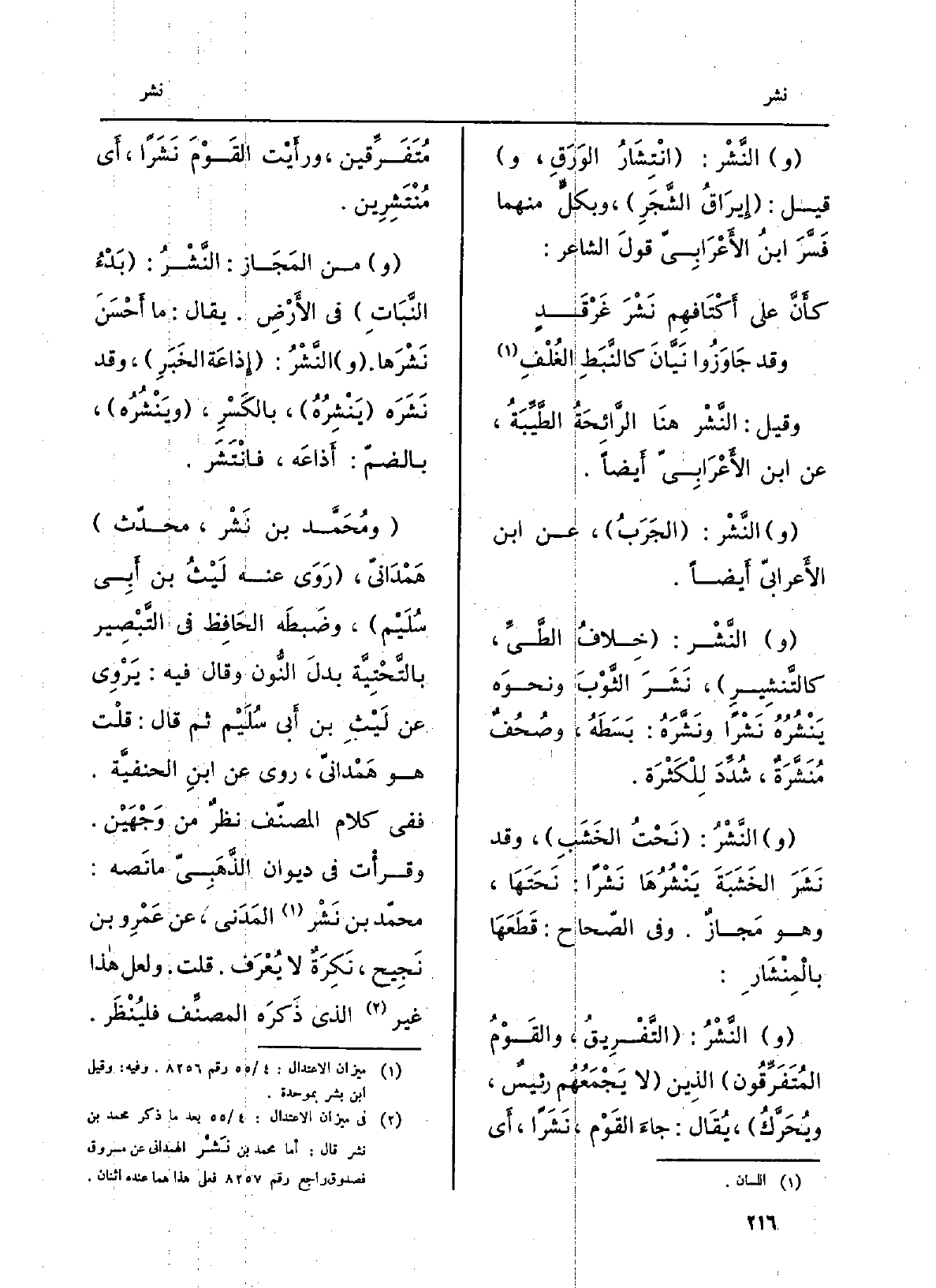 النَّشْرُ: انتشارُ الوَرَقِ، وَقيل: إِيراقُ الشَّجَرِ، وبكُلٍّ مِنْهُمَا فَسَّرَ ابنُ الأَعرابيّ قولَ الشَّاعِر: