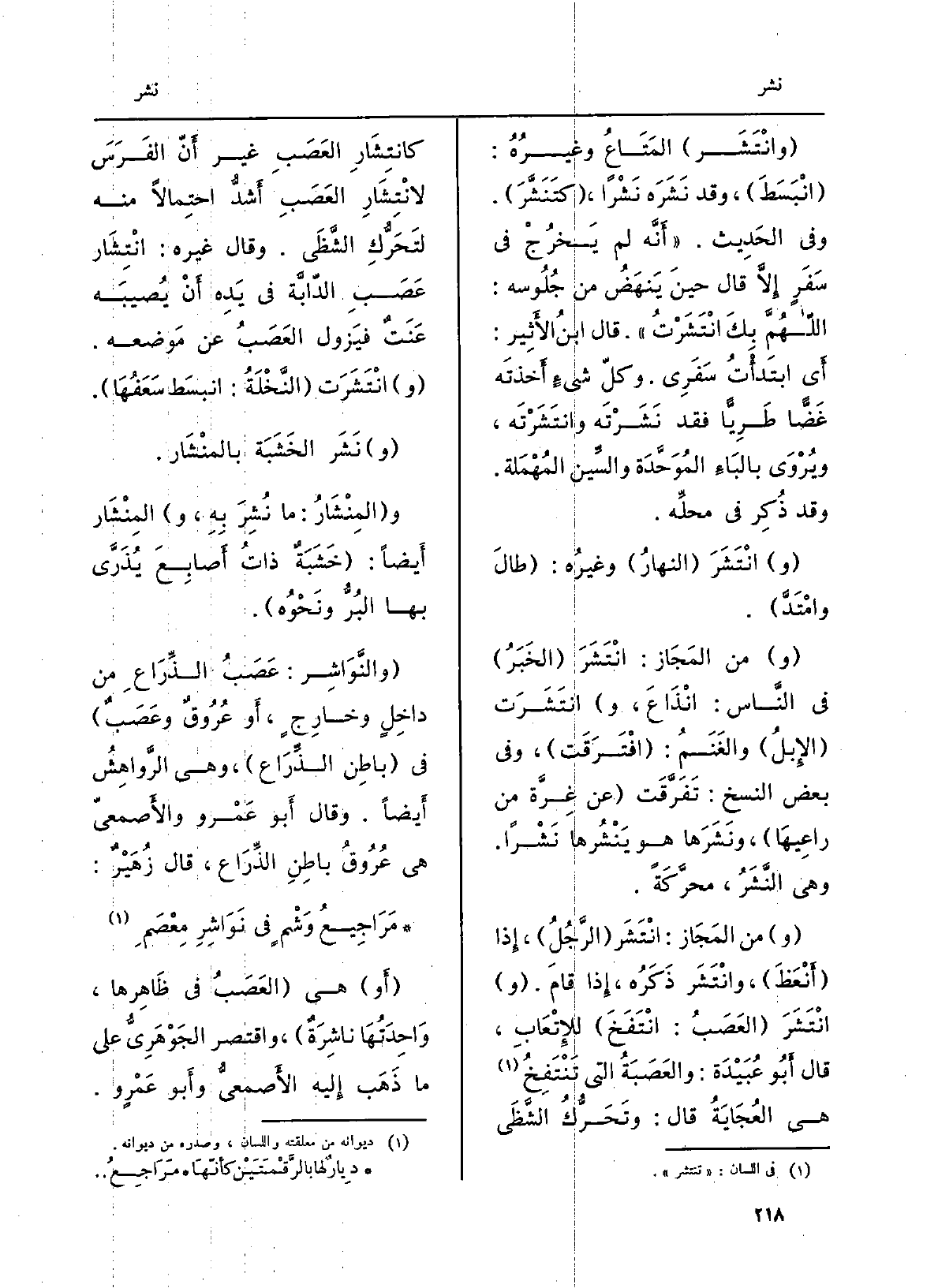 وانْتَشَر المَتاعُ وغيرُه: انْبَسَط، وَقد نَشَرَه نَشْرَاً، كتَنَشَّر. وَفِي الحَدِيث: أنّه لم يَخْرُج فِي سفرٍ إلاّ قَالَ حِين يَنْهَضُ من جُلوسِه: اللهُمَّ بكَ انْتَشَرْت. قَالَ ابنُ الْأَثِير: أَي ابتدأتُ سَفَري. وكلّ شيءٍ أَخَذته غَضَّاً طَرِيَّاً فقد نَشَرْتَه وانتَشَرْته، ويُروى بِالْبَاء المُوَحَّدة والسِّين المُهمَلة. وَقد ذُكر فِي محلِّه. انْتَشَرَ النهارُ وغيرُه: طالَ وامْتَدَّ. منَ المَجاز: انْتَشَرَ الخَبَرُ فِي النَّاس: انْذاعَ، وانتَشَرَت الإبلُ والغَنَمُ: افْتَرَقَتْ، وَفِي بعض النّسخ: تفرَّقتْ عَن غِرَّةٍ من راعِيها، وَنَشَرها هُوَ يَنْشُرها نَشْرَاً. وَهِي النَّشَر، محرَّكةً. منَ المَجاز: انْتَشَر الرجلُ، إِذا أَنْعَظ، وانتشَرَ ذَكَرُه، إِذا قَامَ. انْتَشَرَ العَصَبُ: انْتَفَخَ للإتْعابِ، قَالَ أَبُو عُبَيْدة: والعَصَبَةُ الَّتِي تنتفخ هِيَ العُجايَة، قَالَ: وتحَرُّكُ الشَّظَى كانتِشارِ العَصَبِ غير أنّ الفرَسَ لانتِشارِ العَصَبِ أشدُّ احْتِمَالا مِنْهُ لتحرُّك الشَّظَى. وَقَالَ غيرُه: انتِشار عَصَبِ الدّابَّةِ فِي يَدِه أنْ يُصيبه عَنَتٌ فيزول العَصَبُ عَن مَوْضِعه. انْتَشَرَت النَّخلةُ: انبسَطَ سعَفُها. نَشَرَ الخَشَبَة بالمِنْشار. والمِنْشار: مَا نُشِرَ بِهِ، والمِنْشار أَيْضا: خَشَبَةٌ ذاتُ أصابعَ يُذَرَّى بهَا البُرُّ ونَحْوُه. والنَّواشِر: عَصَبُ الذِّراع من داخلٍ وخارجٍ، أَو عروقٌ وَعَصَبٌ فِي باطنِ الذِّراع، وَهِي الرَّواهِشُ أَيْضا. وَقَالَ أَبُو عَمْرو والأصمعيّ هِيَ عروقُ باطِنِ الذِّراع، قَالَ زُهَيْر: مَراجيعُ وَشْمٍ فِي نَواشِرِ مِعْصَمِ أَو هِيَ العَصَبُ فِي ظاهِرِها، واحدَتُها ناشِرَةٌ، واقتصرَ الجَوْهَرِيّ على مَا ذهبَ إِلَيْهِ الأصمعيُّ وَأَبُو عَمْروٍ.