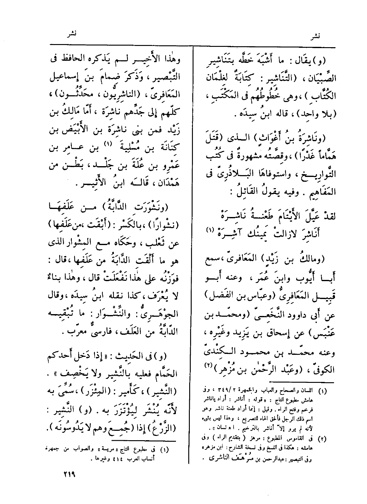 يُقَال: مَا أَشْبَه خَطَّه بتَناشيرِ الصِّبيان، التَّناشير: كتابةٌ لغِلْمان الكُتَّاب، وَهِي خطوطُهم فِي المَكْتَبِ، بِلَا وَاحِد، قَالَه ابنُ سِيدَه. وناشِرَةُ بن أَغْوَاثٍ الَّذِي قَتَلَ هَمَّاماً غَدْرَاً، وقصَّتُه مشهورةٌ فِي كتب التَّواريخ، واستوفاها البَلاذُرِيّ فِي المَفاهيم. وَفِيه يَقُول الْقَائِل:
