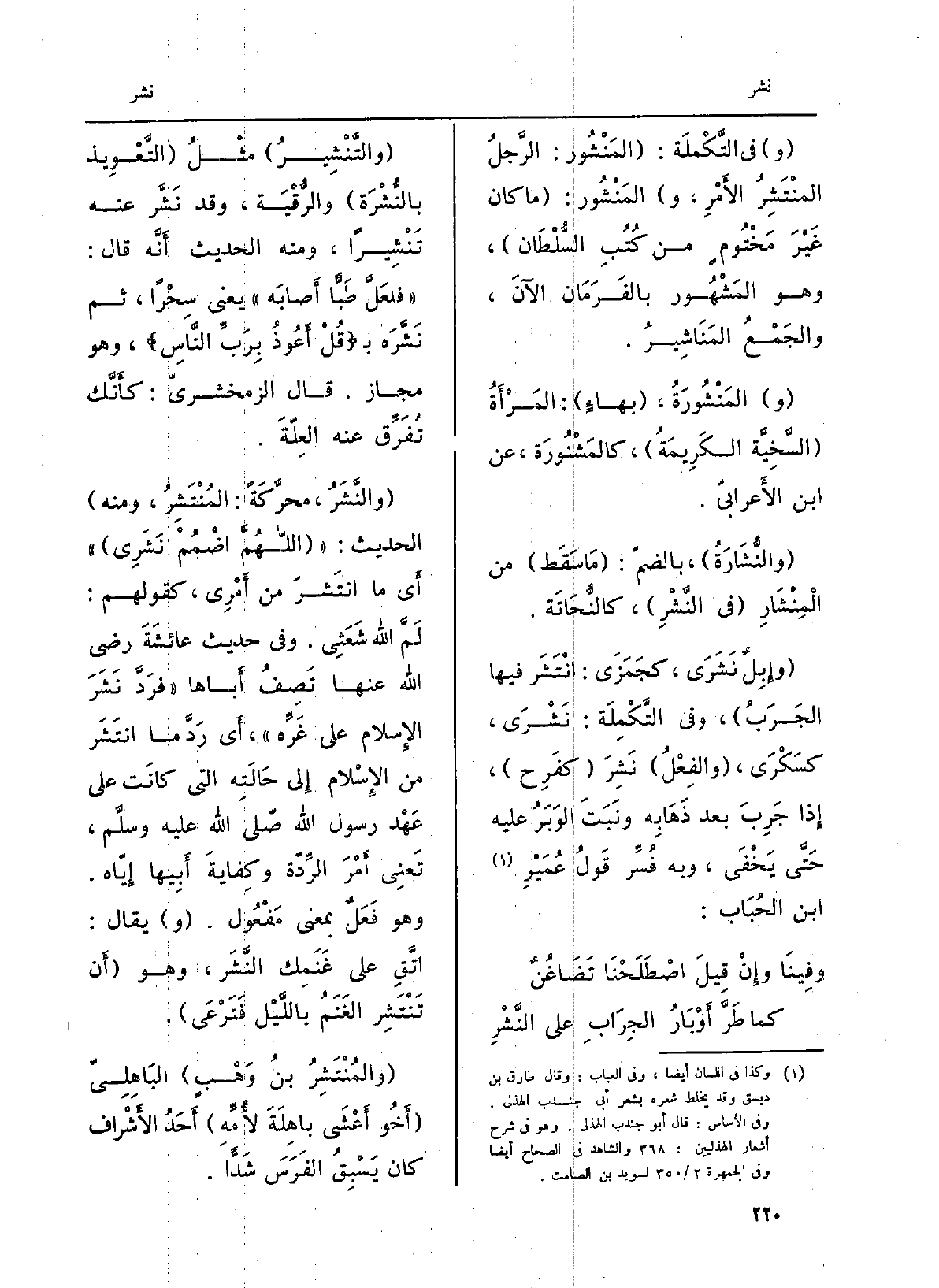 والتَّنْشير مثلُ التَّعويذ بالنُّشْرَة والرُّقْيَة، وَقد نَشَّر عَنهُ تَنْشِيراً، وَمِنْه الحَدِيث أنّه قَالَ: فلعلَّ طَبَّاً أَصَابَهُ يَعْنِي سِحْراً، ثمَّ نَشَّرَه ب: قُل أعوذُ برَبِّ النَّاسِ، وَهُوَ مجَاز. قَالَ الزَّمَخْشَرِيّ: كَأَنَّك تُفرِّق عَنهُ العِلَّة. والنَّشَرُ، محرَّكةً: المُنْتَشِرُ، وَمِنْه الحَدِيث: اللَّهُمَّ اضْمُمْ نَشَري أَي مَا انتشرَ من أَمْرِي، كَقَوْلِهِم: لَمَّ الله شعَثي. وَفِي حَدِيث عائشةَ رَضِي الله عَنْهَا تَصِفُ أَبَاهَا: فَرَدَّ نَشَرَ الْإِسْلَام على غَرِّه، أَي رَدَّ مَا انتشَرَ من الْإِسْلَام إِلَى حالتِه الَّتِي كَانَت على عَهْدِ رَسُول الله صلّى الله عَلَيْهِ وسلَّم، تَعْنِي أَمْرَ الرِّدَّة وكِفايةَ أَبِيهَا إيّاه. وَهُوَ فَعَلٌ بِمَعْنى مَفْعُول. يُقَال: اتَّقِ على غنَمِكَ النَّشَر، وَهُوَ أَن تَنْتَشِرَ الغنَمُ باللَّيْل فَتَرْعى. والمُنْتَشِرُ بنُ وَهْبٍ الباهِلِيّ أَخُو أَعْشَى باهِلَةَ لأمِّه أحدُ الأشرافِ كَانَ يَسْبِقُ الفرَسَ شَدَّاً.