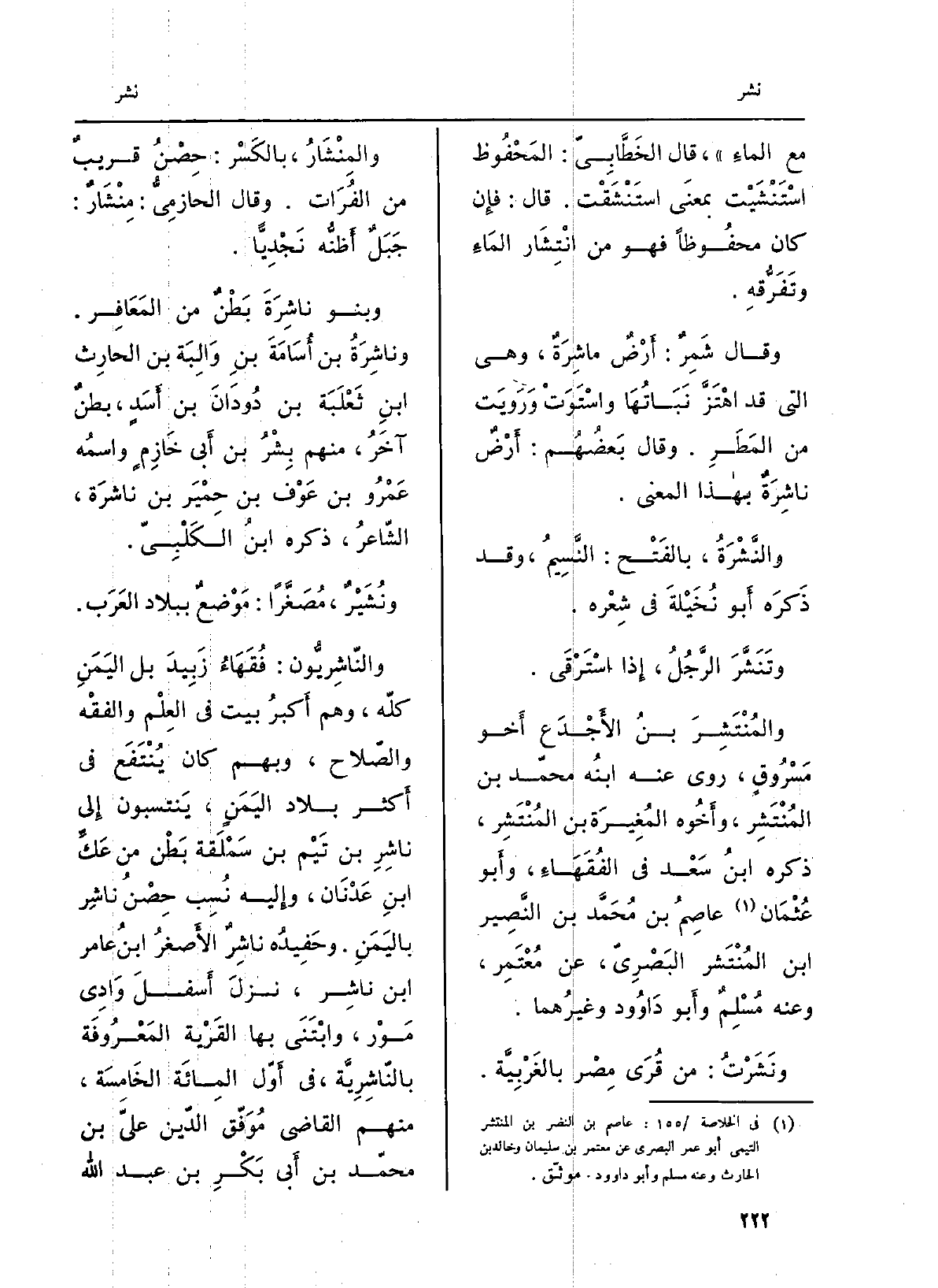 وَقَالَ الحازميُّ: مِنْشار: جبلٌ أظنُّه نَجْدِيَّاً. وَبَنُو ناشِرَة بَطْنٌ من المَعافِر. وناشِرَةُ بن أُسَامَة بنِ والبة بن الْحَارِث بنِ ثَعْلَبَة بن دُودان بن أسدٍ، بطنٌ آخر، مِنْهُم بِشْرُ بن أبي خازمٍ واسمُه عَمْرُو بن عَوْف بن حِمْيَر بن ناشِرَة، الشَّاعِر، ذكره ابنُ الكلبيّ. ونُشَيْرٌ، مُصغَّراً: موضعٌ بِبِلَاد الْعَرَب. والنّاشِريُّون: فقهاءُ زَبيد بل الْيمن كلّه، وهم أكبر بَيت فِي الْعلم وَالْفِقْه والصّلاح، وبهم كَانَ يُنتفَع فِي أَكثر بلادِ الْيمن، ينتسبون إِلَى ناشِر بن تَيْم بن سَمْلَقة بَطْن من عَكِّ بنِ عدنان، وَإِلَيْهِ نُسِب حِصنُ ناشِر بِالْيمن. وحفيدُه ناشِرٌ الْأَصْغَر بنُ عَامر بن ناشِر، نزلَ أسفلَ وَادي مَوْر، وابْتَنى بهَا الْقرْيَة الْمَعْرُوفَة بالنّاشريَّة، فِي أول الْمِائَة الخامسَة، مِنْهُم القَاضِي مُوفَّق الدّين عليّ بن مُحَمَّد بن أبي بكر بن عبد الله