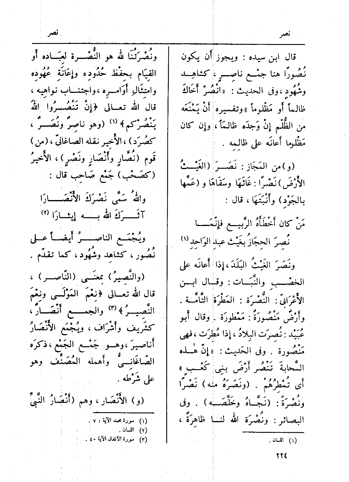 ويُجمَع الناصرُ أَيْضا على نُصور، كشاهد وشُهود، كَمَا تقدّم. والنَّصِيرُ بِمَعْنى النّاصر قَالَ اللهُ تَعَالَى: نِعْمَ المَولى ونِعمَ النَّصير وَالْجمع أَنْصَار، كشَريف وأَشْرَاف، ويُجمَع الأَنْصار أناصير، وَهُوَ جَمْعُ الْجمع، ذَكَرَه الصَّاغانِيّ وَأَهْمَلَهُ المُصنِّف وَهُوَ على شَرْطِه. الأنْصار، وهم أَنْصَارُ النبيّ