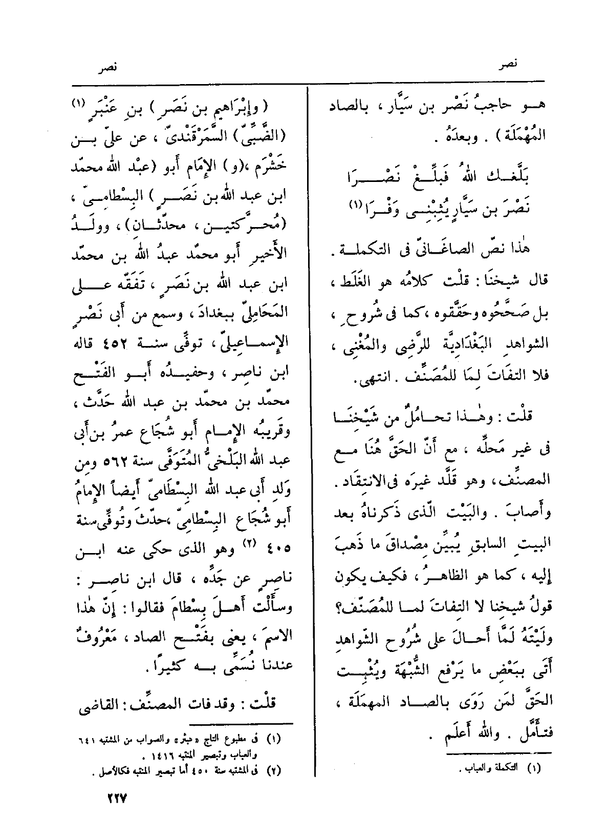 ذهبَ إِلَيْهِ، كَمَا هُوَ الظَّاهِر، فَكيف يكون قولُ شَيخنَا لَا التفاتَ لما للمُصنِّف وَلَيْتَهُ لَمَّا أحالَ على شُرُوح الشواهد أَتَى ببعضِ مَا يَرْفَع الشُّبْهة ويُبِت الحقَّ لمن روى بالصَّاد الْمُهْملَة، فتأمّل. وَالله أعلم. وَإِبْرَاهِيم بن نَصَرِ بنِ عَنْبَرٍ الضَّبِّيّ السَّمَرْقَنْدِيّ، عَن عليّ بن خَشْرَم، الإِمَام أَبُو عبد الله مُحَمَّد بن عبد الله بن نَصَر البِسْطاميّ، مُحرَّكتَيْن، محدِّثان، وولَدُ الْأَخير أَبُو مُحَمَّد عَبْد الله بن مُحَمَّد بن عَبْد الله بن نَصَر، تفقَّه على المَحامِلِيّ بِبَغْدَاد، وَسمع من أبي نَصْرٍ الإسماعيليّ، توفّي سنة قَالَه ابْن نَاصِر، وحفيدُه أَبُو الْفَتْح مُحَمَّد بن مُحَمَّد بن عَبْد الله حَدَّث، وقريبُه الإِمَام أَبُو شُجَاع عمر بن أبي عَبْد الله البَلْخيّ المُتوَفَّى سنة وَمن ولدِ أبي عَبْد الله البِسطاميّ أَيْضا الإمامُ أَبُو شُجَاع البِسطاميّ، حدّث وتُوفّي سنة وَهُوَ الَّذِي حكى عَنهُ ابنُ ناصرٍ عَن جدِّه، قَالَ ابْن نَاصِر: وسألْتُ أهلَ بِسْطام فَقَالُوا: إنّ هَذَا الاسمَ، يَعْنِي بِفَتْح الصَّاد، معروفٌ عندنَا نُسمِّي بِهِ كثيرا. قلت: وَقد فَاتَ المُصنِّف: القَاضِي