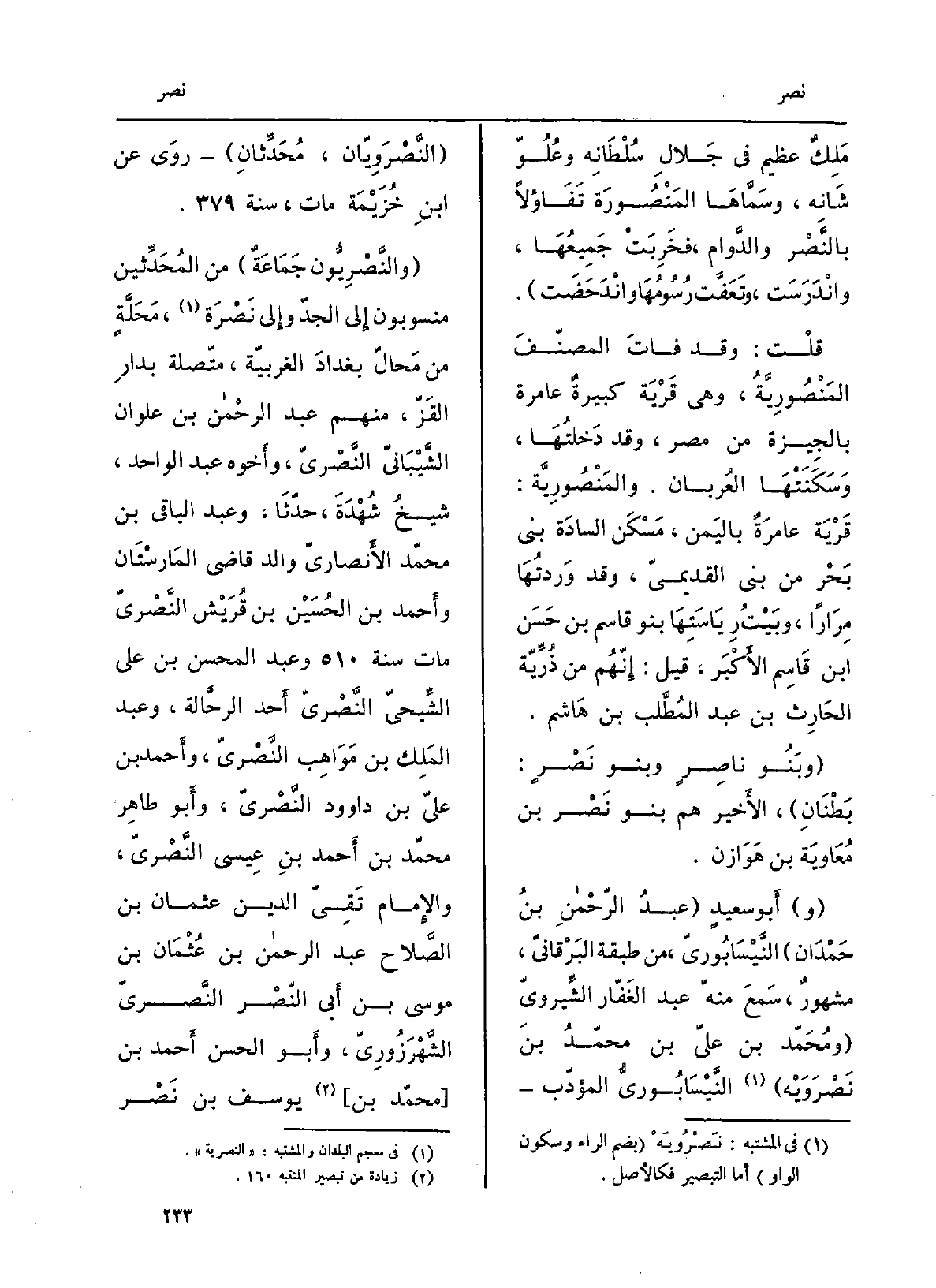 البَرْقانيّ، مشهورٌ، سَمِعَ مِنْهُ عبد الغَفَّار الشِّيرويّ، وَمُحَمّد بن عليّ بن مُحَمَّد بن نَصْرَوَيْه النَّيْسابوريّ الْمُؤَدب النَّصْرَوِيان، مُحَدِّثان روى عَن ابنِ خُزَيْمة، مَاتَ سنة. والنَّصْرِيُّون جماعةٌ من المُحَدِّثين منسوبون إِلَى الجدّ وَإِلَى نَصْرَة، محَلَّةٍ من مَحالّ بَغْدَاد الغربيّة، مُتَّصِلَة بدارِ الشَّيْبانيّ النَّصْرِيّ، وَأَخُوهُ عبد الْوَاحِد، شيخُ شُهْدَة، حَدَّثا، وَعبد الْبَاقِي بن مُحَمَّد الأنصاريّ وَالِد قَاضِي المارسْتان وَأحمد بن الْحُسَيْن بن قُرَيْش النَّصْريّ مَاتَ سنة وَعبد المحسن بن عَليّ الشِّيحيّ النَّصْريّ أحد الرَّحَّالة، وَعبد الْملك بن مَواهب النَّصْرِيّ، وَأحمد بن عليّ بن دَاوُود النَّصْريّ، وَأَبُو طَاهِر مُحَمَّد بن أَحْمد بن عِيسَى النَّصْريّ، وَالْإِمَام تَقِيّ الدّين عُثْمَان بن الصَّلاح عبد الرَّحْمَن بن عُثْمَان بن مُوسَى بن أبي النَّصْر النَّصْريّ الشَّهْرَزُورِيّ، وَأَبُو الْحسن أَحْمد بن مُحَمَّد بن يُوسُف بن نَصْر