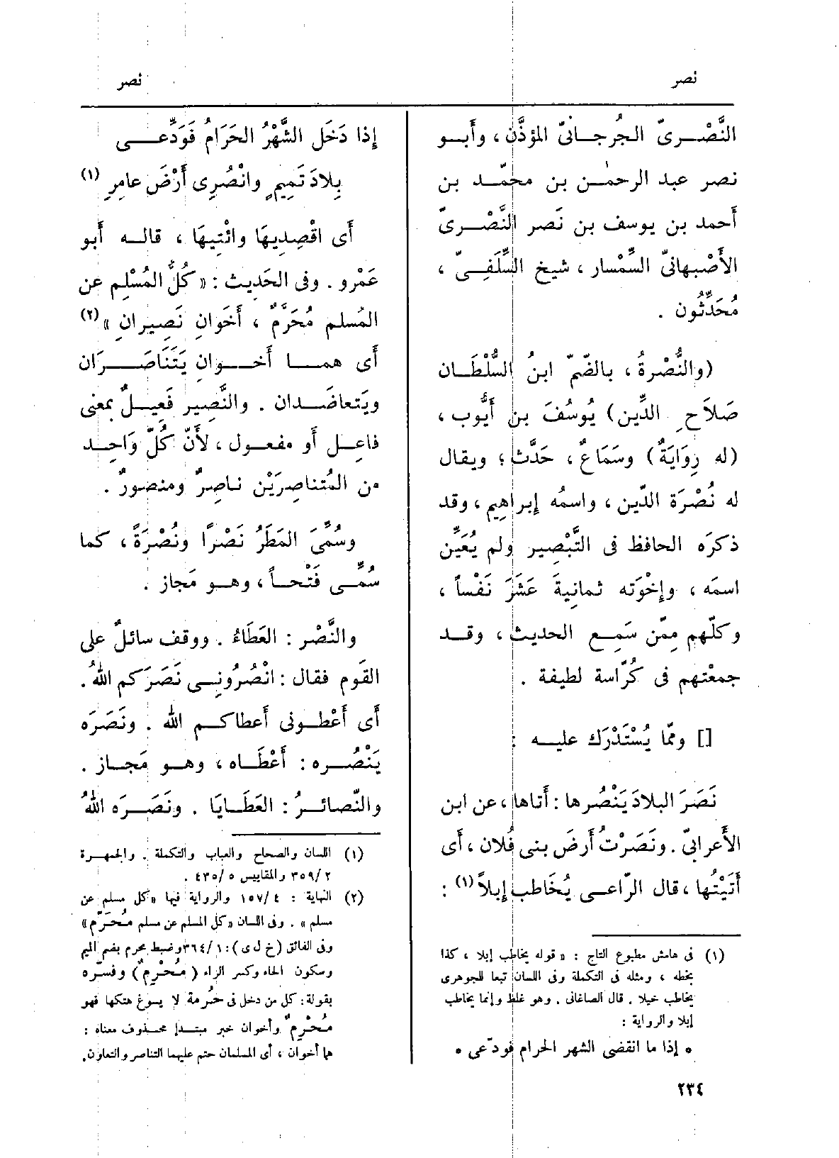 النَّصْريّ الجُرْجانيّ المُؤذِّن، وَأَبُو نصر عبد الرَّحْمَن بن مُحَمَّد بن أَحْمد بن يُوسُف بن نصر النَّصْريّ الأصْبهانيّ السِّمْسار، شيخ السِّلَفيّ، مُحَدِّثون. والنُّصْرَة، بالضمّ ابنُ السُّلْطَان صَلَاح الدّين يُوسُف بن أيُّوب، لَهُ روايةٌ وسَماعٌ، حدَّث وَيُقَال لَهُ نُصْرَة الدّين، واسمُه إِبْرَاهِيم، وَقد ذَكَرَه الْحَافِظ فِي التَّبْصير وَلم يُعيِّن اسمَه، وإخوتُه ثمانيةَ عَشَرَ نَفْسَاً، وكلّهم ممّن سَمِعَ الحَدِيث، وَقد جمعْتُهم فِي كُرّاسةٍ لَطِيفَة. ومِمّا يُسْتَدْرَك عَلَيْهِ: نَصَرَ البلادَ يَنْصُرها: أَتَاهَا، عَن ابْن الأعرابيّ. ونصَرْتُ أرضَ بني فلَان: أَي أَتَيْتُها، قَالَ الرَّاعِي يُخاطبُ إبِلا: